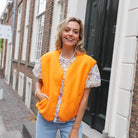 Dit trendy teddy gilet in een heldere oranje kleur is een echte must-have voor de koudere dagen. Het gilet heeft een zachte, knuffelbare textuur en een comfortabele pasvorm. Perfect om over een trui, blouse of jas te dragen voor een extra warme en stijlvolle laag met een speelse touch!