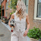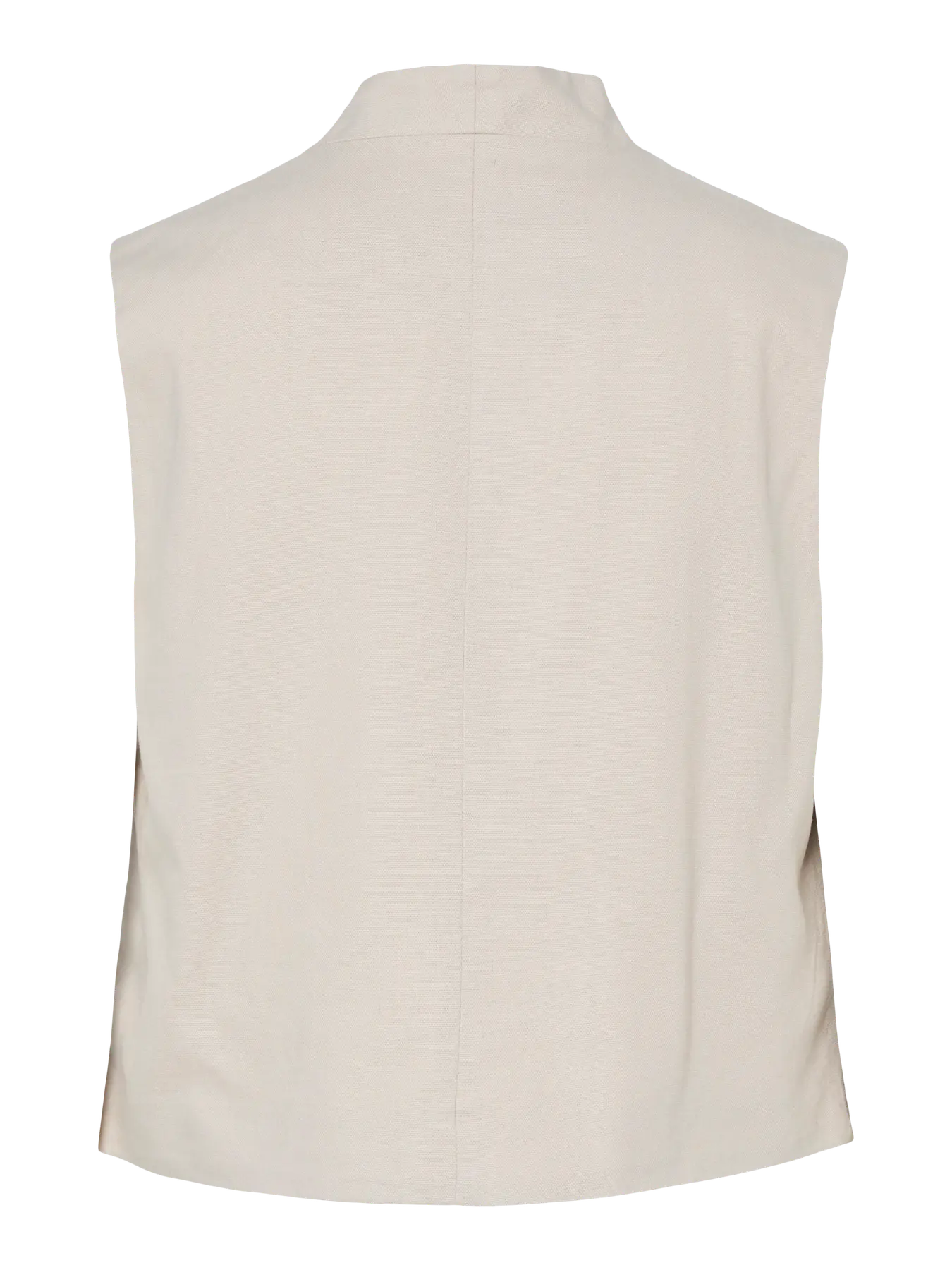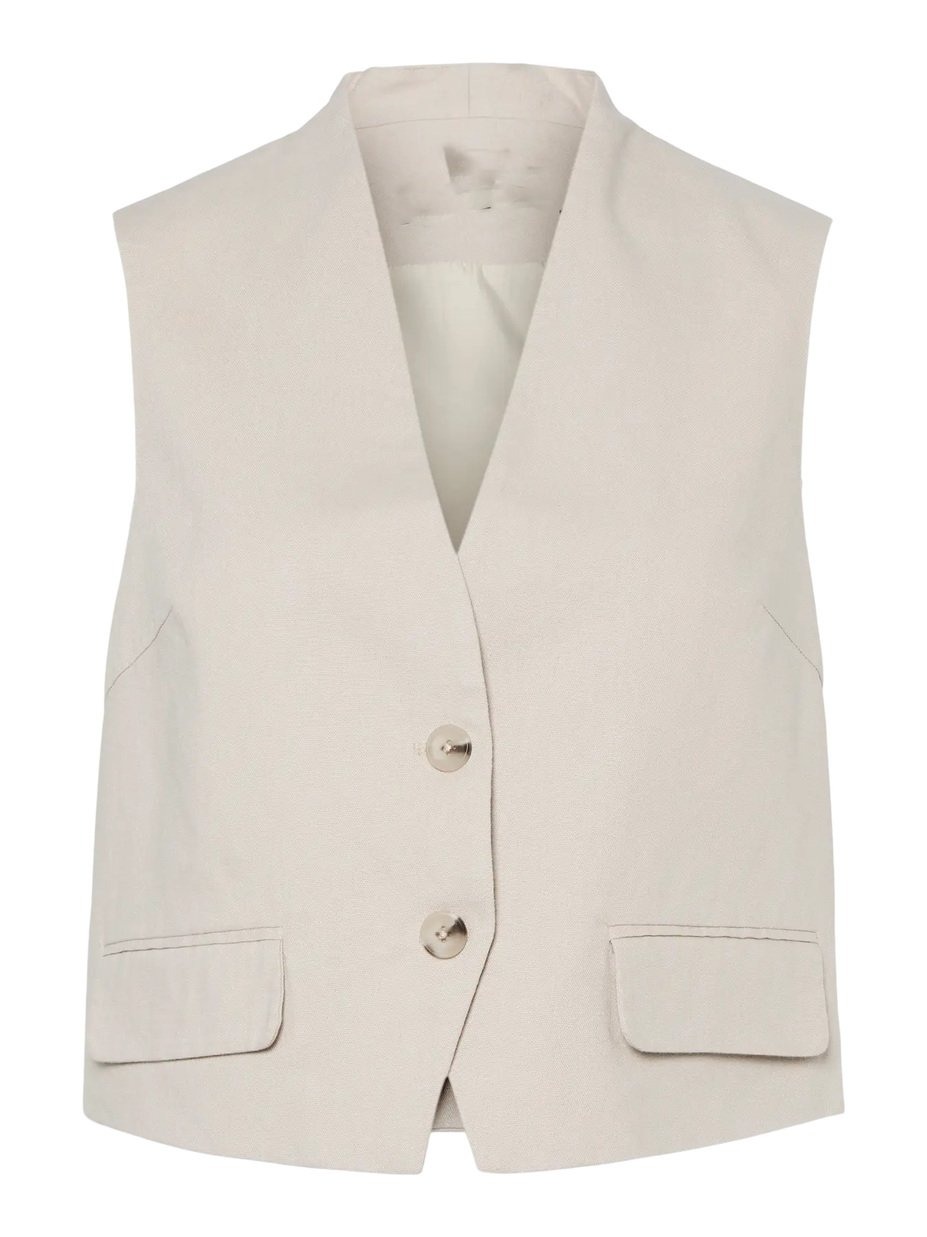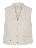 Dit trendy, mouwloze gilet in een lichte, natuurlijke tint is een stijlvolle toevoeging aan je outfit! De getailleerde pasvorm en de knoopsluiting zorgen voor een elegante look. De handige zakken aan de voorkant maken het gilet zowel modieus als praktisch. Gemaakt van een mix van linnen, viscose, polyester en een vleugje katoen, heeft het een mooie textuur en draagt het comfortabel. Draag het over een blouse, T-shirt of jurkje voor een sophisticated en moderne uitstraling.
