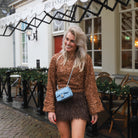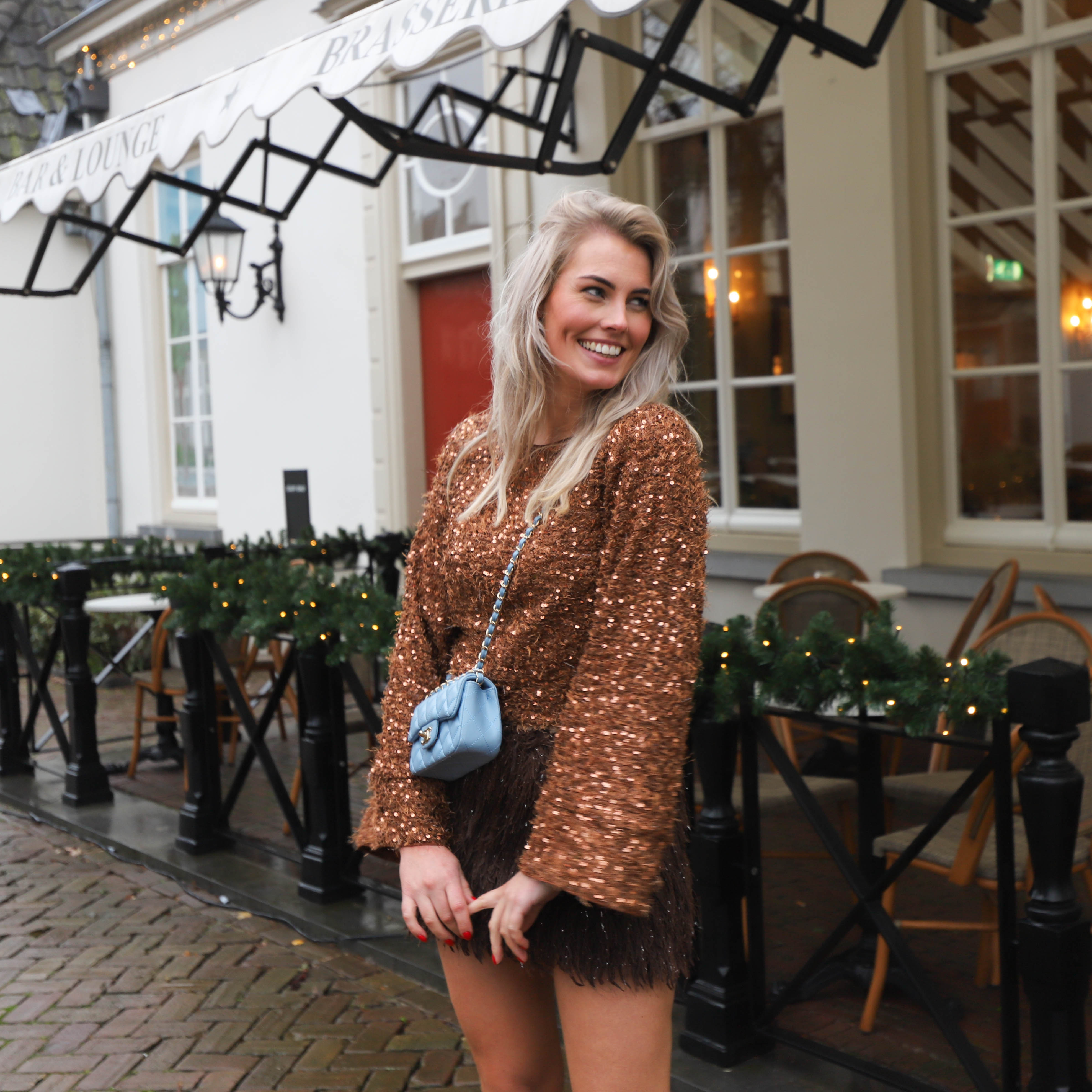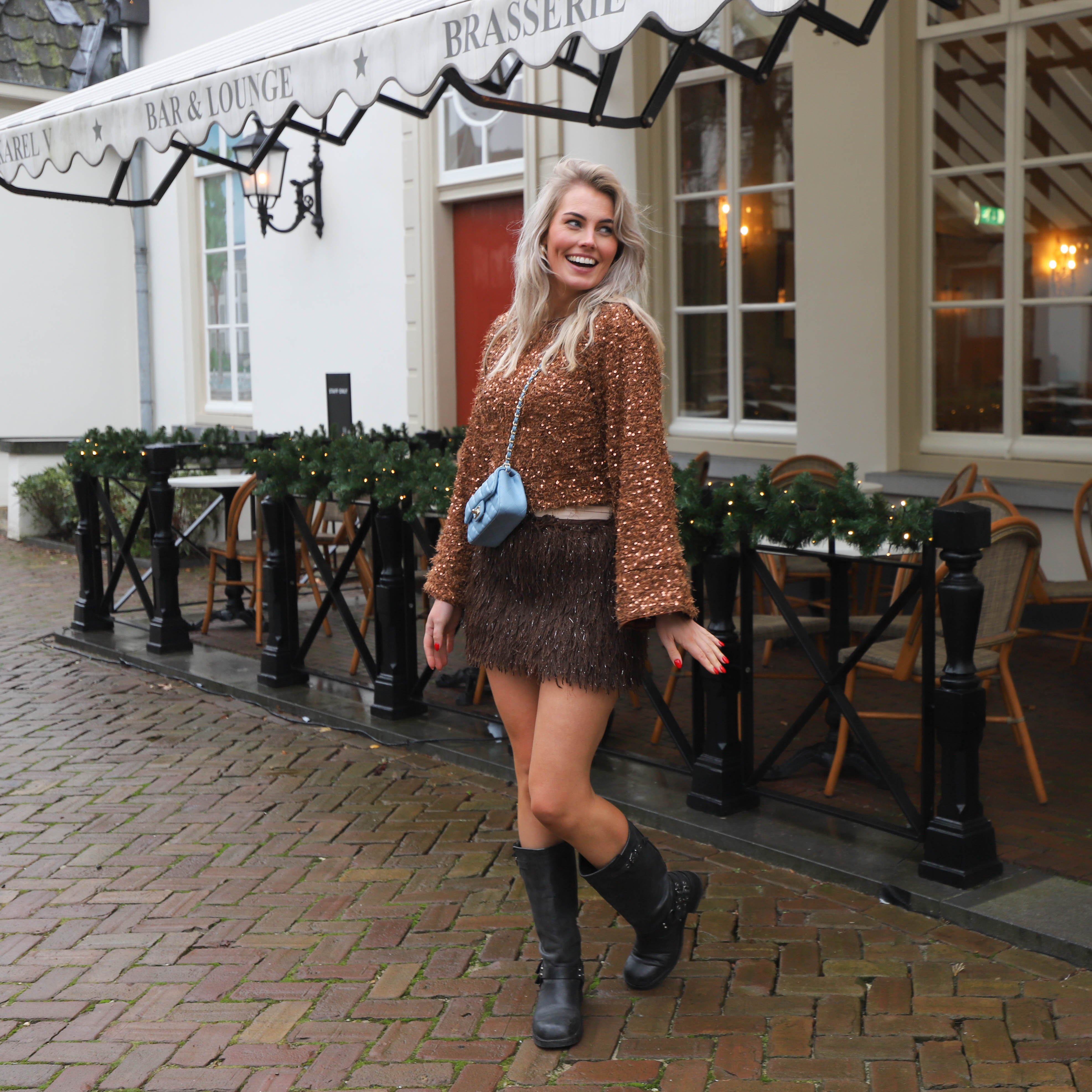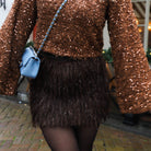 Mooie blouse vol glitters in een bronze kleur. De top heeft lange mouwen en zit heerlijk. Comfortabel, speels en ready to shine.