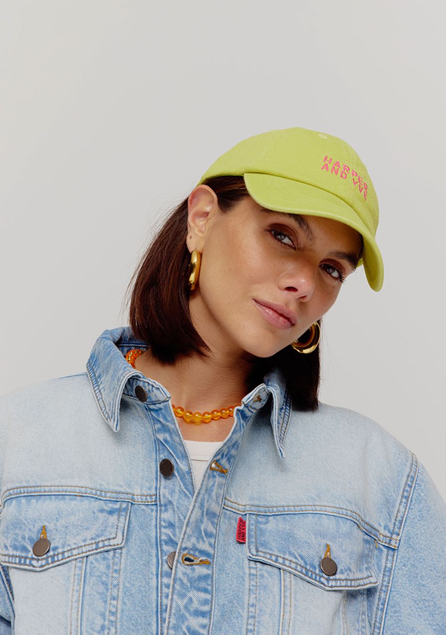 Top off your outfit. Deze cap is de finishing touch voor elke zomerse look. De frisse LIME kleur met contrasterende roze borduring zorgt voor een speels accent, terwijl het zachte katoenmateriaal comfortabel zit, zelfs op de warmste dagen. Combineer met je favoriete co-ord of draag ‘m casual met een basic tee en denim short. Cap on, vibes up.