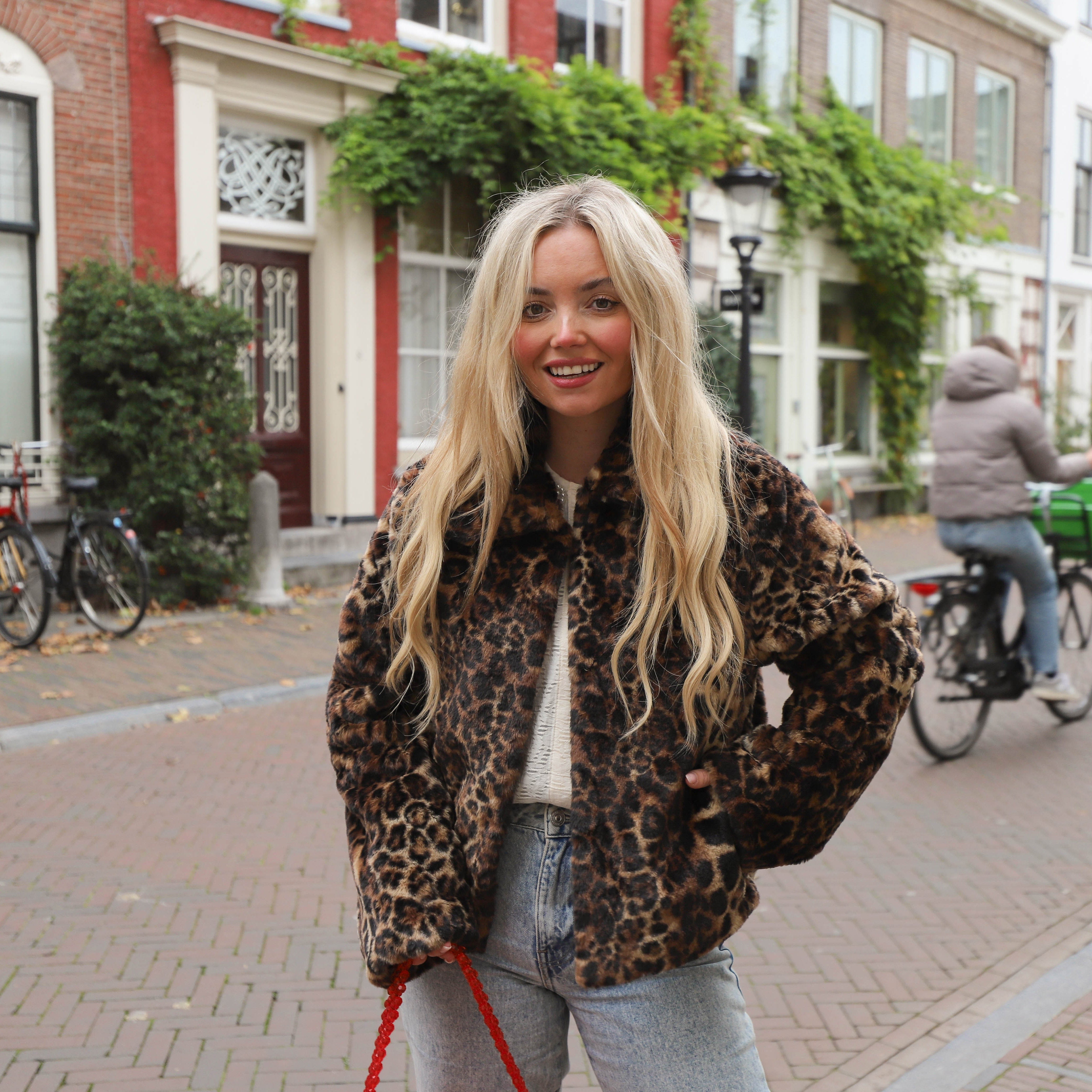 Mooie jas van Noisy May met panterprint. Het jasje heeft een kort model en een kraag. Fleurt elke outfit op!