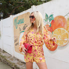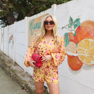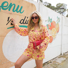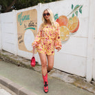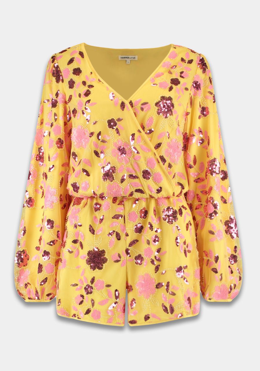 Ready to shine bright? Deze opvallende jumpsuit is bezaaid met pailletten in zomerse tinten die je instant in de party mood brengen. De soepele pasvorm, diepe V-hals en lange mouwen maken het een perfecte keuze voor zonnige dagen en zwoele avonden. Your summer statement has arrived.