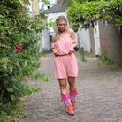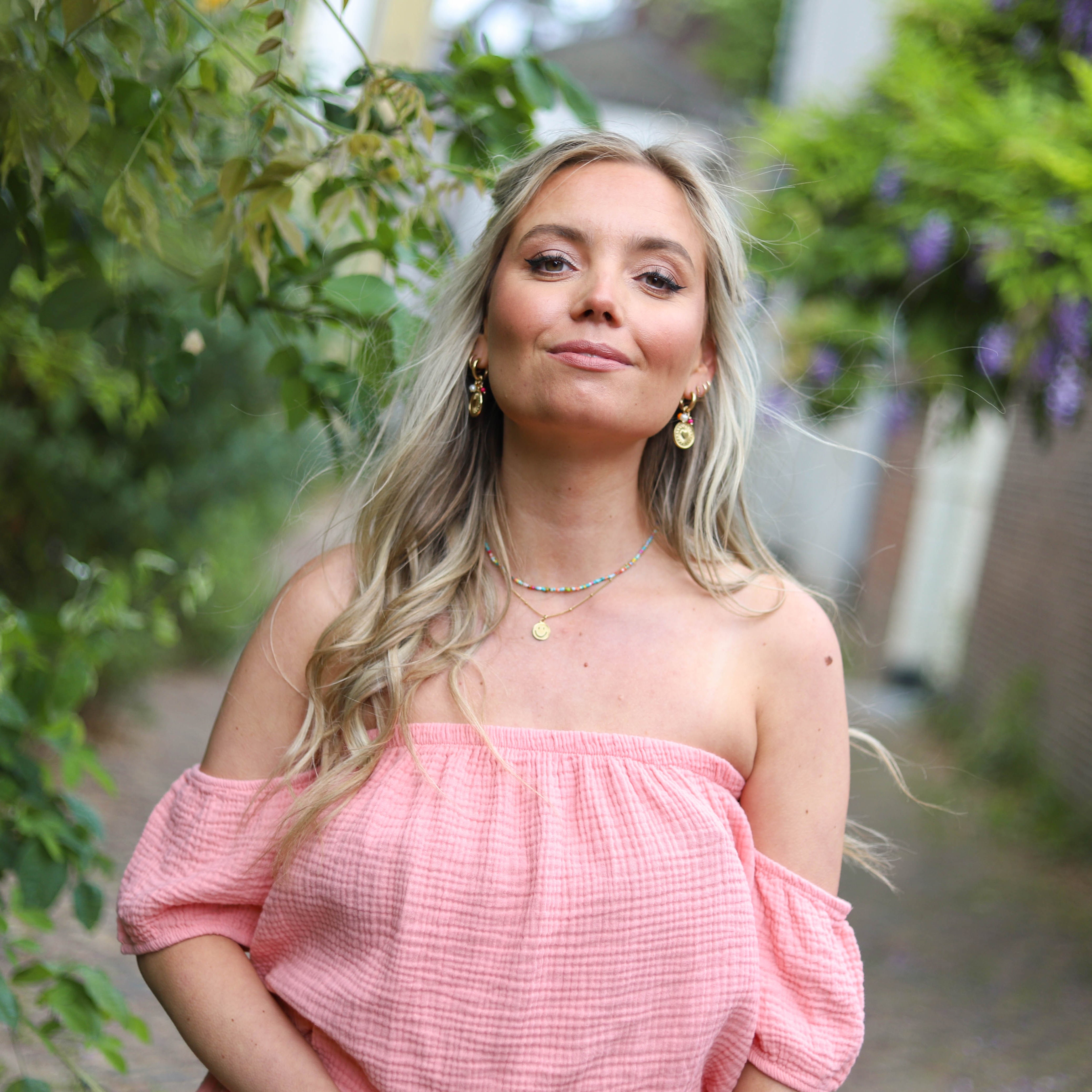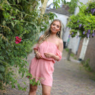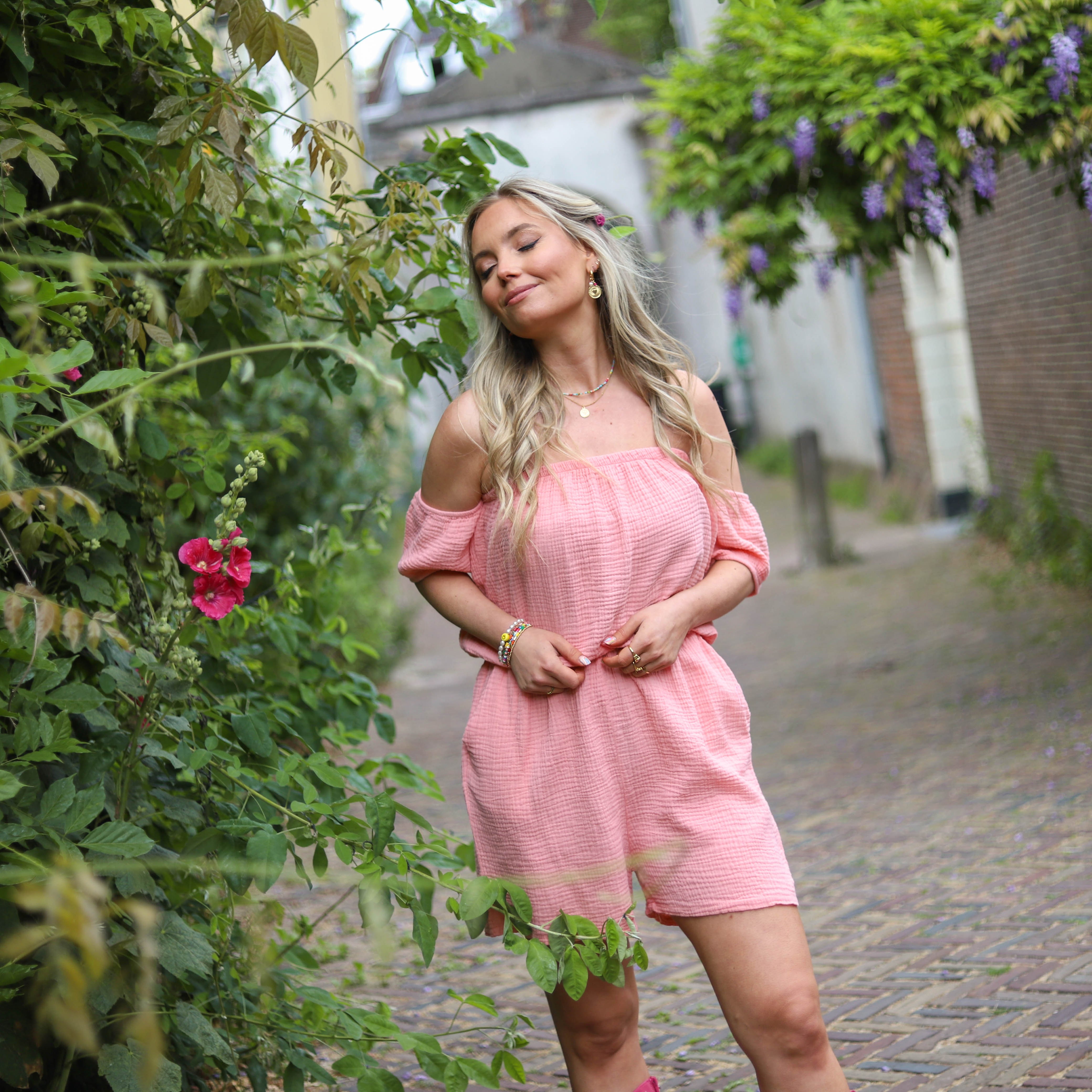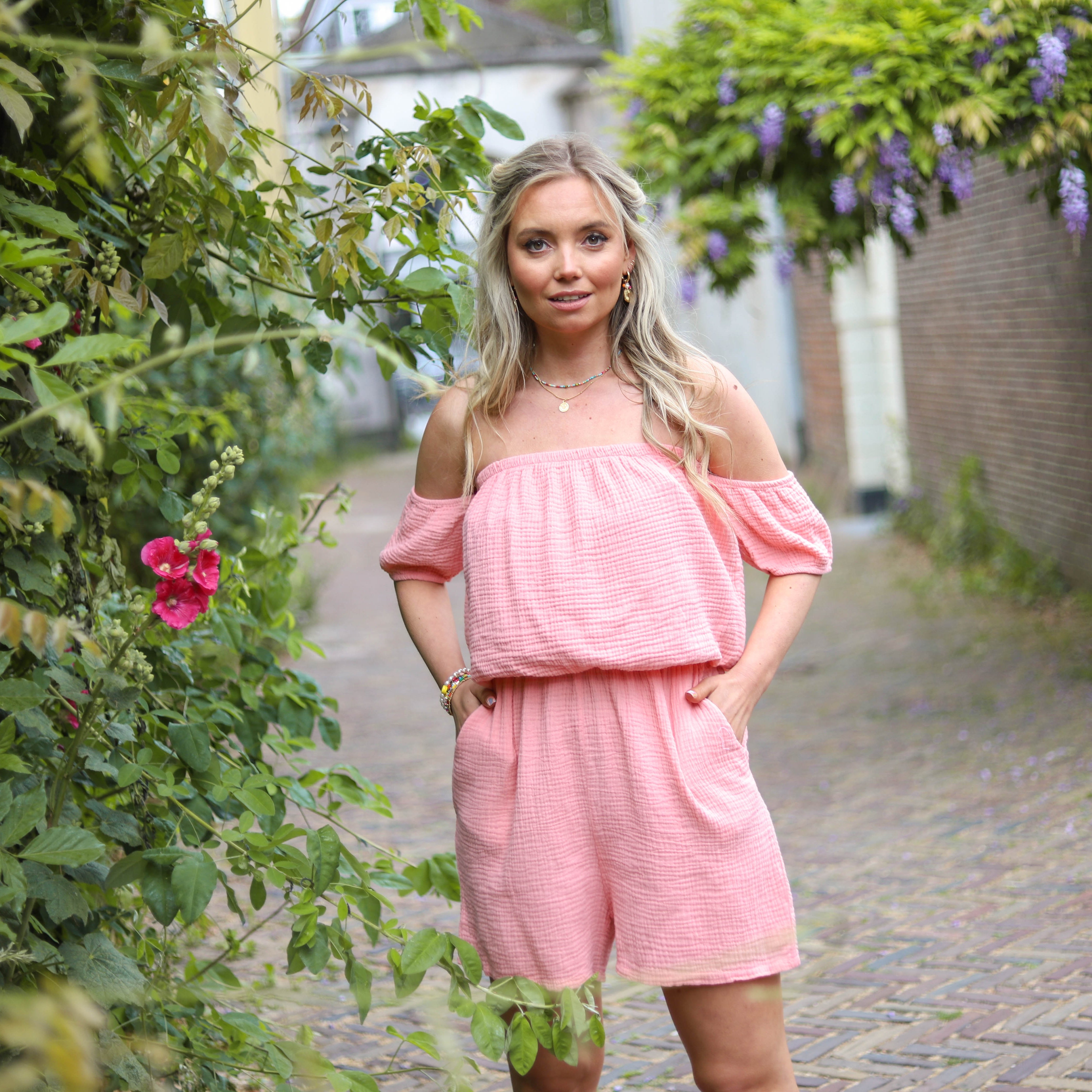 Mooie off shoulder playsuit in een vrolijke kleur. De playsuit is wat strakker in de taille en heeft twee zakken aan de voorkant. Maak het af met een tasje en een paar leuke schoenen.