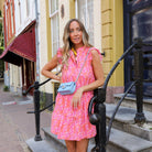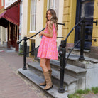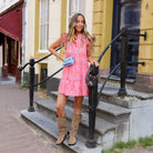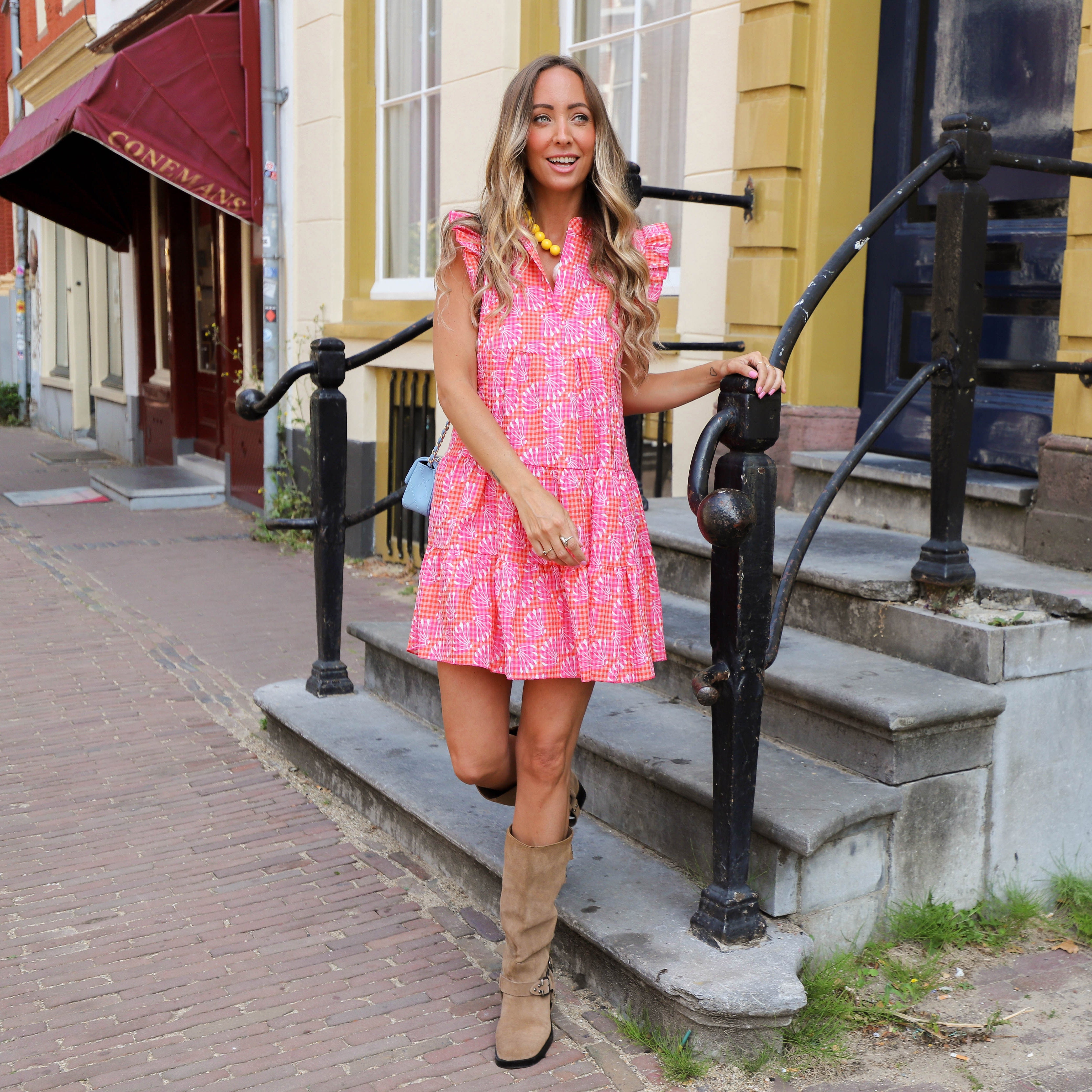 Dit speelse 'Fie jurk koraal' is een charmante zomerjurk met een levendige print die bestaat uit een geruit patroon in koraalrood en wit, gecombineerd met witte bloemachtige motieven. De jurk heeft een V-hals met een kleine opstaande kraag en ruches langs de mouwopeningen. De taille is licht geplooid, wat zorgt voor een flatterend en zwierig model.