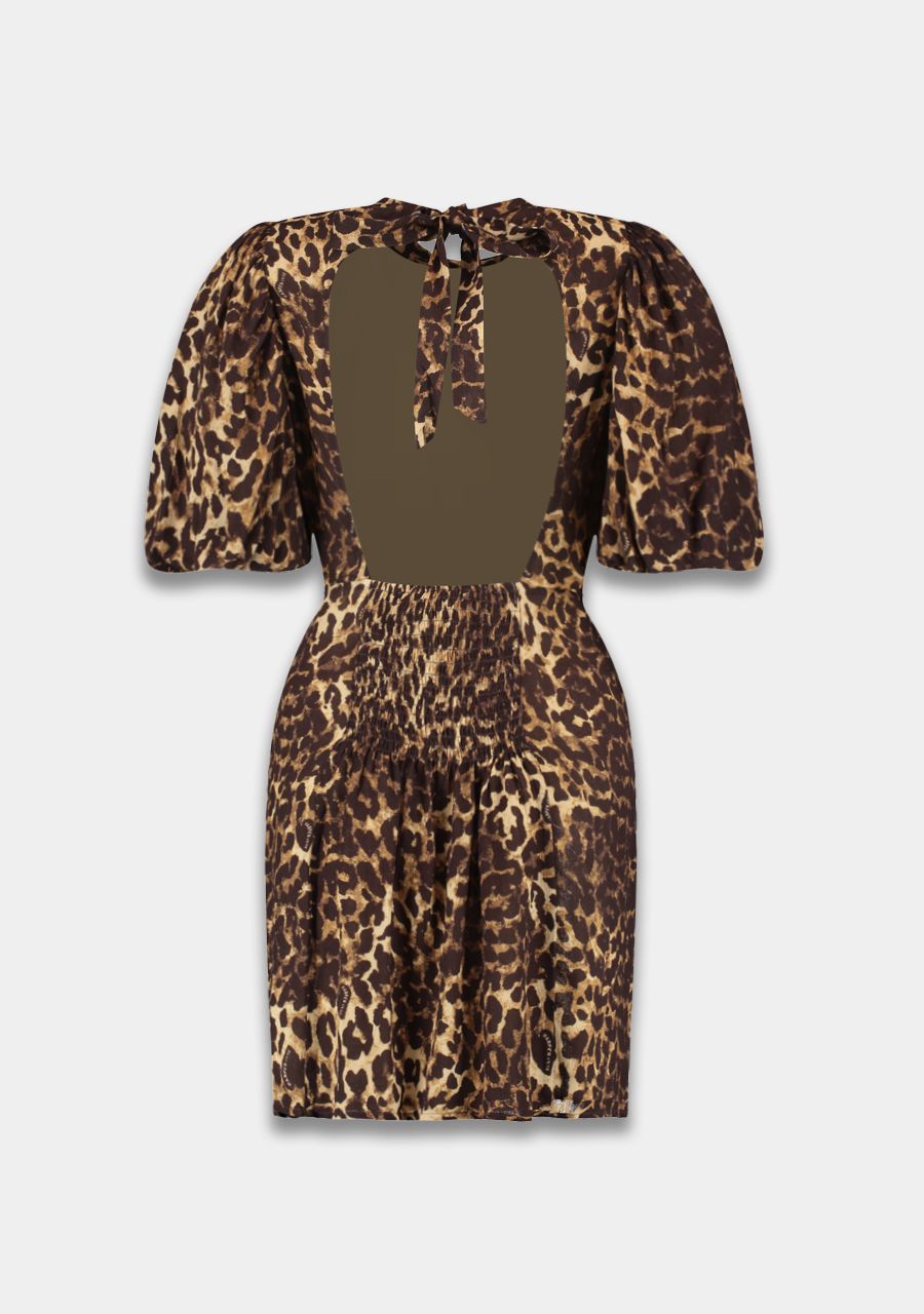 Deze jurk straalt vrouwelijkheid en lef uit dankzij het opvallende leopard design. De pofmouwen geven een dramatisch silhouet, terwijl de hoge halslijn voor een elegante touch zorgt. Aan de achterkant verrast de jurk met een diepe open rug en een speelse striksluiting in de nek. De elastische tailleband aan de achterzijde zorgt voor een comfortabele en flatterende pasvorm. Combineer haar met boots of hakken voor een krachtige look. Feel fierce and fabulous all day long.