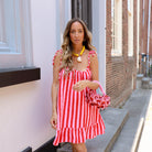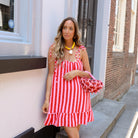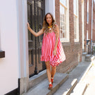 Dit zomerse 'Jurk mousseline roze rood' is een vrolijke en luchtige jurk, perfect voor warme dagen. De jurk heeft een gestreept patroon in rood en lichtroze en is gemaakt van een licht kreukelige mousseline stof. De spaghettibandjes zijn te strikken op de schouders, en de onderkant van de jurk is voorzien van een speelse ruche.