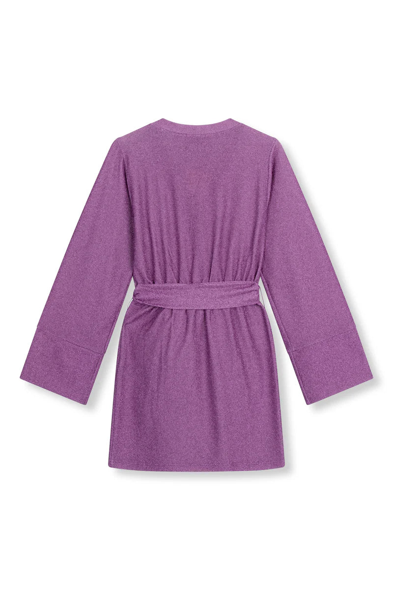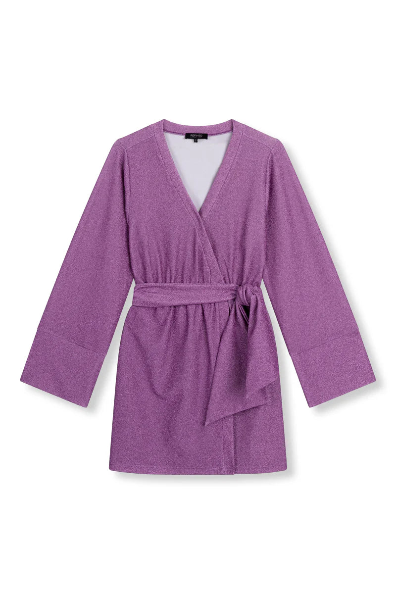 Dit glamoureuze wikkeljurkje is een must-have voor elke gelegenheid. Het jurkje in de kleur pink is gemaakt van een zachte stof met een subtiel glittereffect, wat zorgt voor een elegante uitstraling. De flatterende v-hals en de elastische tailleband accentueren je figuur op de juiste manier. De lange mouwen met brede manchetten en de bijpassende ceintuur maken de look helemaal af.