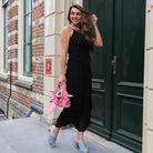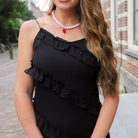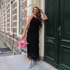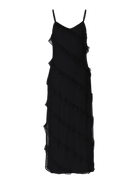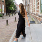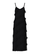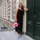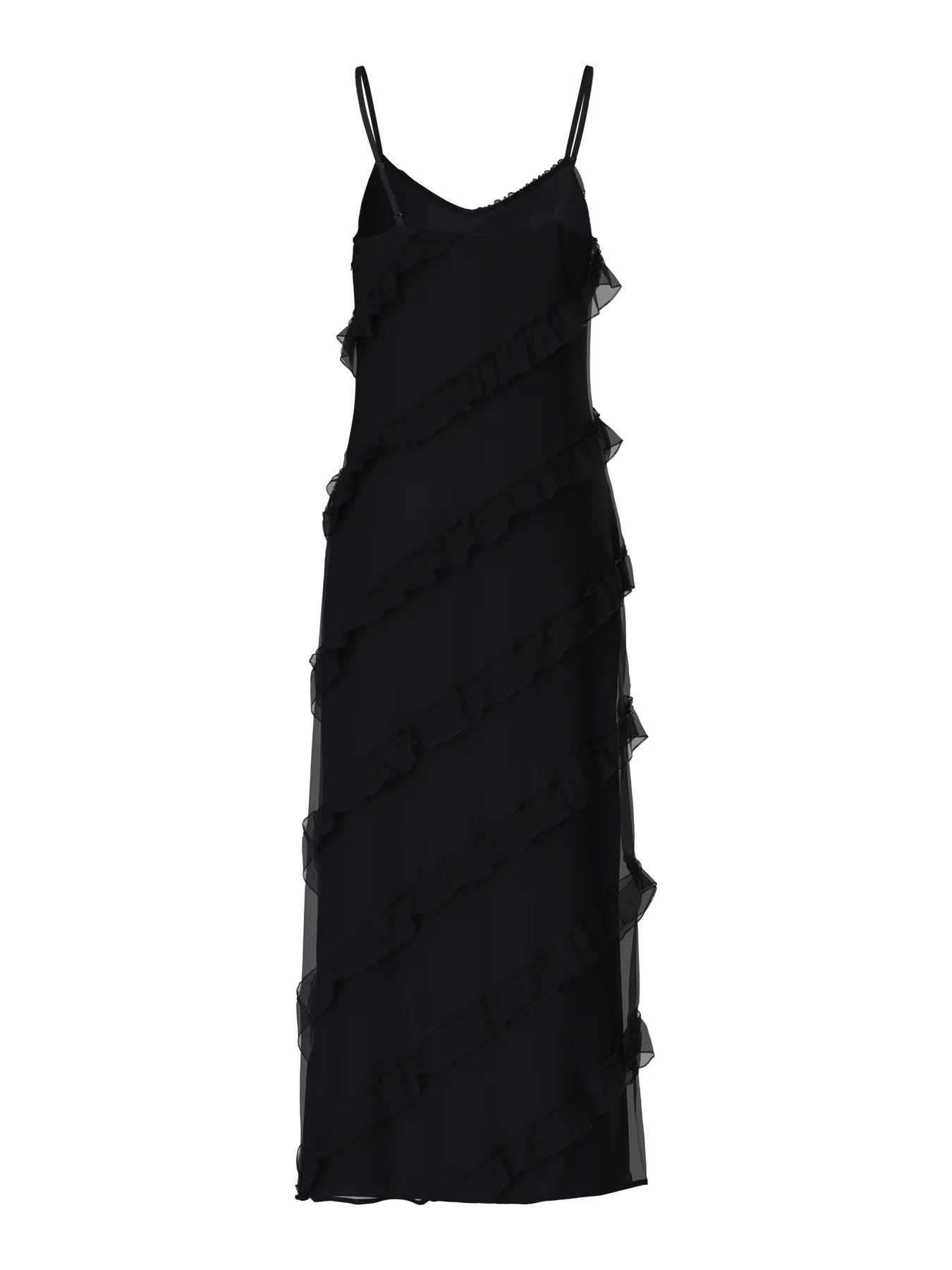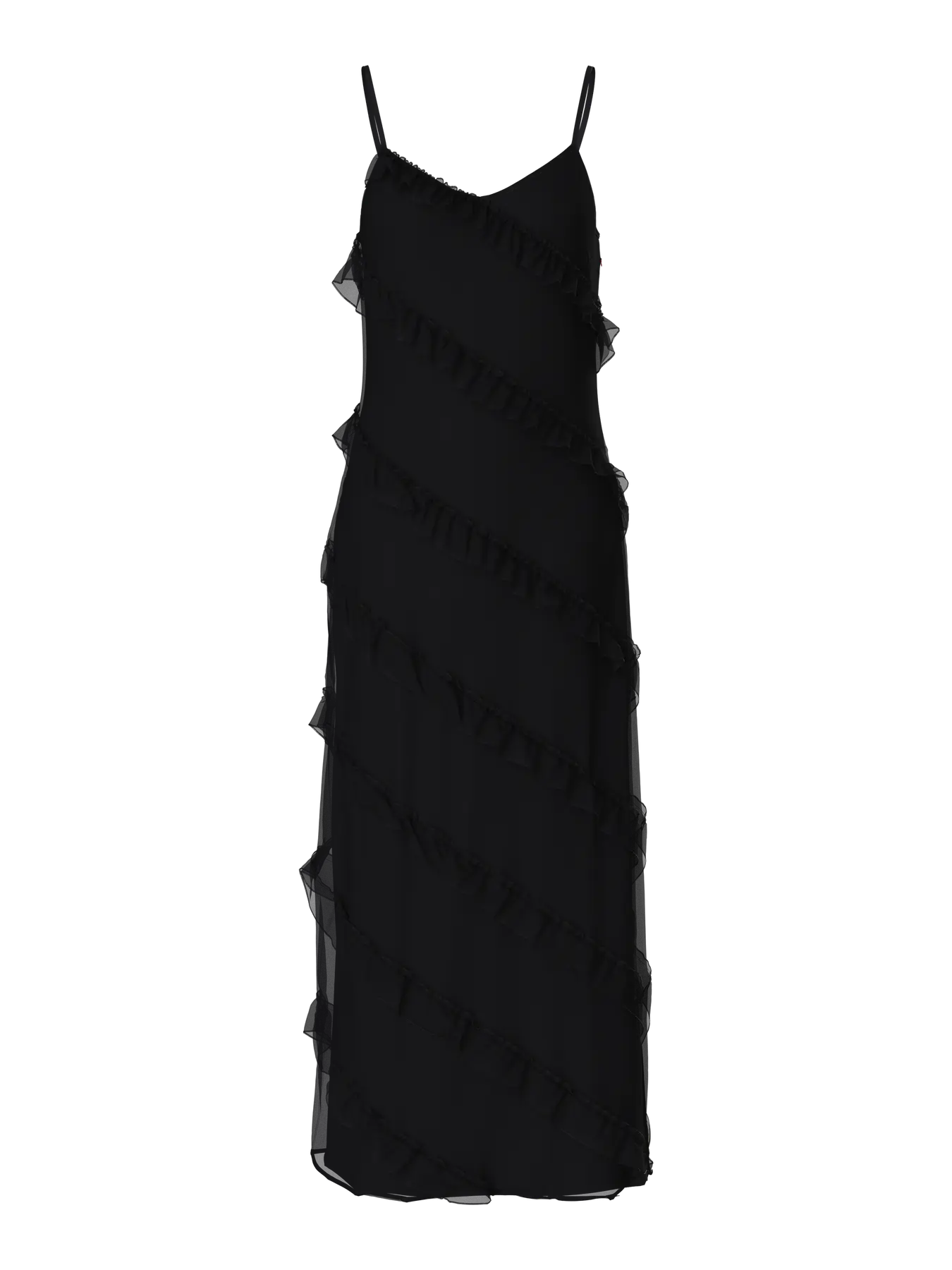Deze lange zwarte jurk is een absolute must-have voor elke gelegenheid, van een zomerse avond uit tot een chique evenement. De jurk is voorzien van delicate spaghettibandjes en heeft een flatterende pasvorm die wordt versterkt door de speelse, diagonale ruches die over de gehele lengte van de jurk lopen. Deze ruches creëren een dynamische en romantische uitstraling.