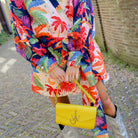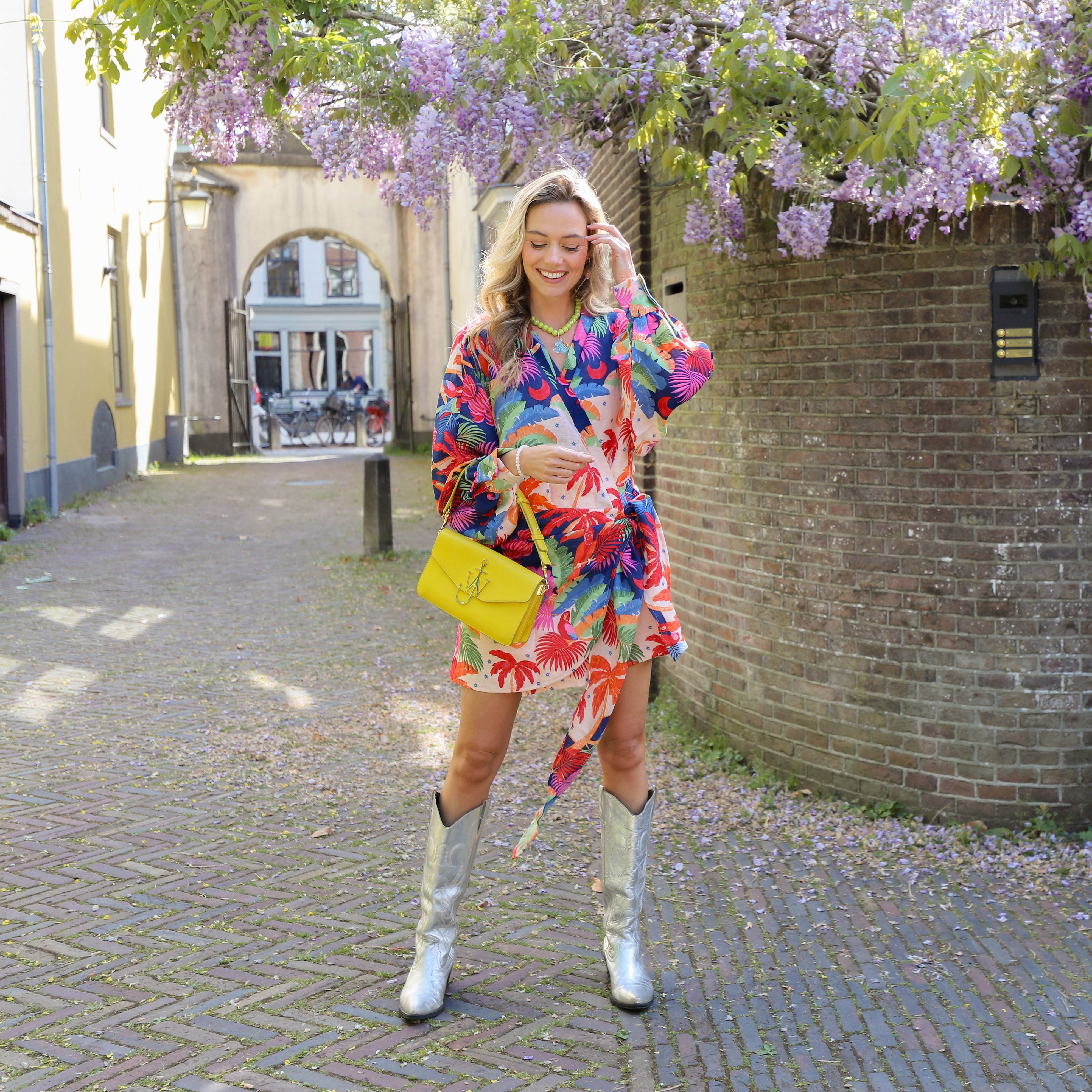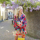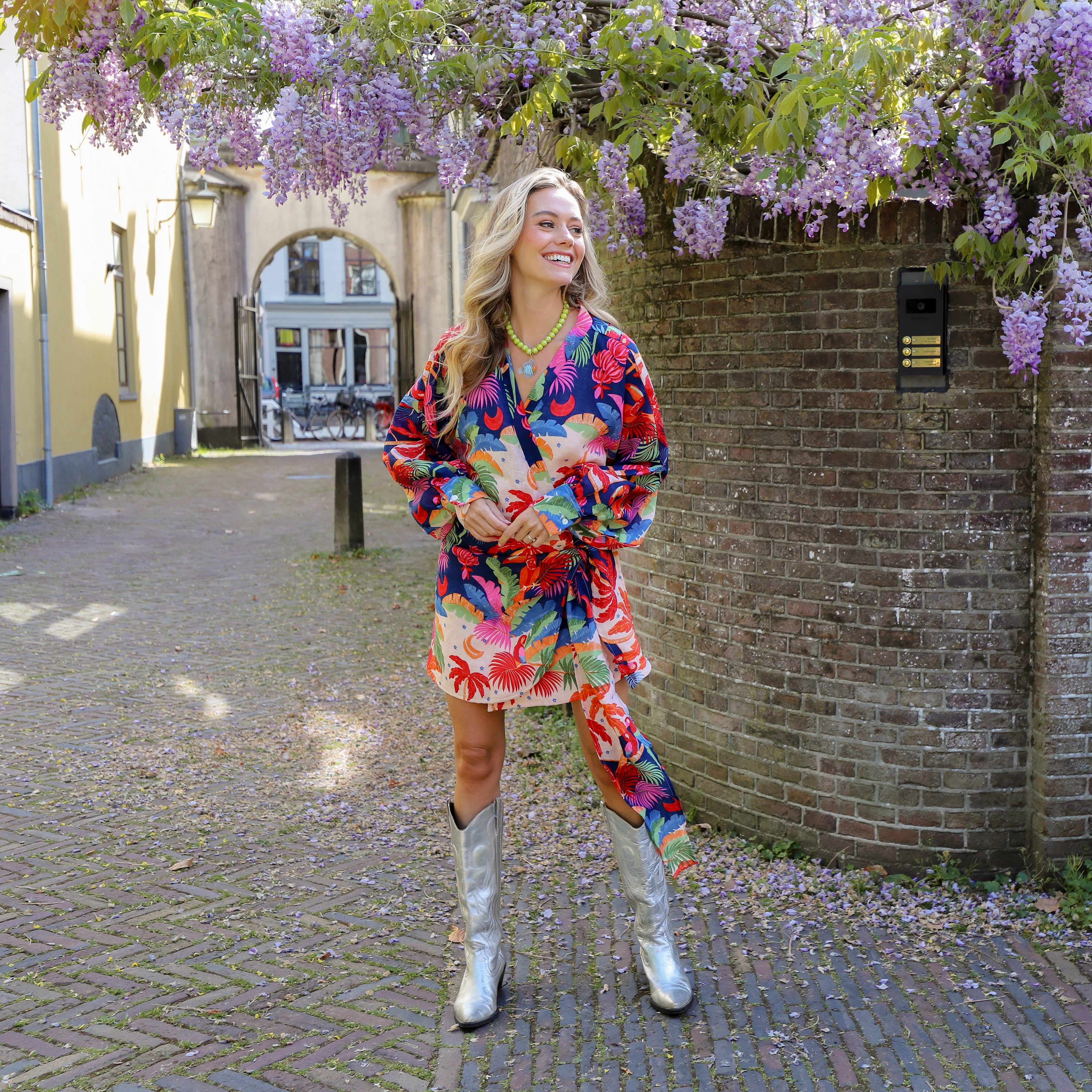 Deze opvallende wikkeljurk met kleurrijke print is een echte blikvanger! De speelse strepen geven de jurk een vrolijke en energieke uitstraling. De wikkelconstructie zorgt voor een flatterende pasvorm en een vrouwelijk silhouet. Je kunt de taille naar wens accentueren met de bijpassende strikceintuur. De lange mouwen maken deze jurk perfect voor zowel zonnige dagen als de wat koelere avonden.