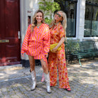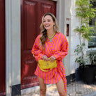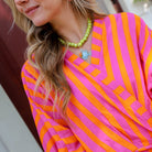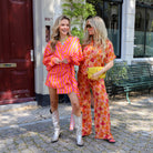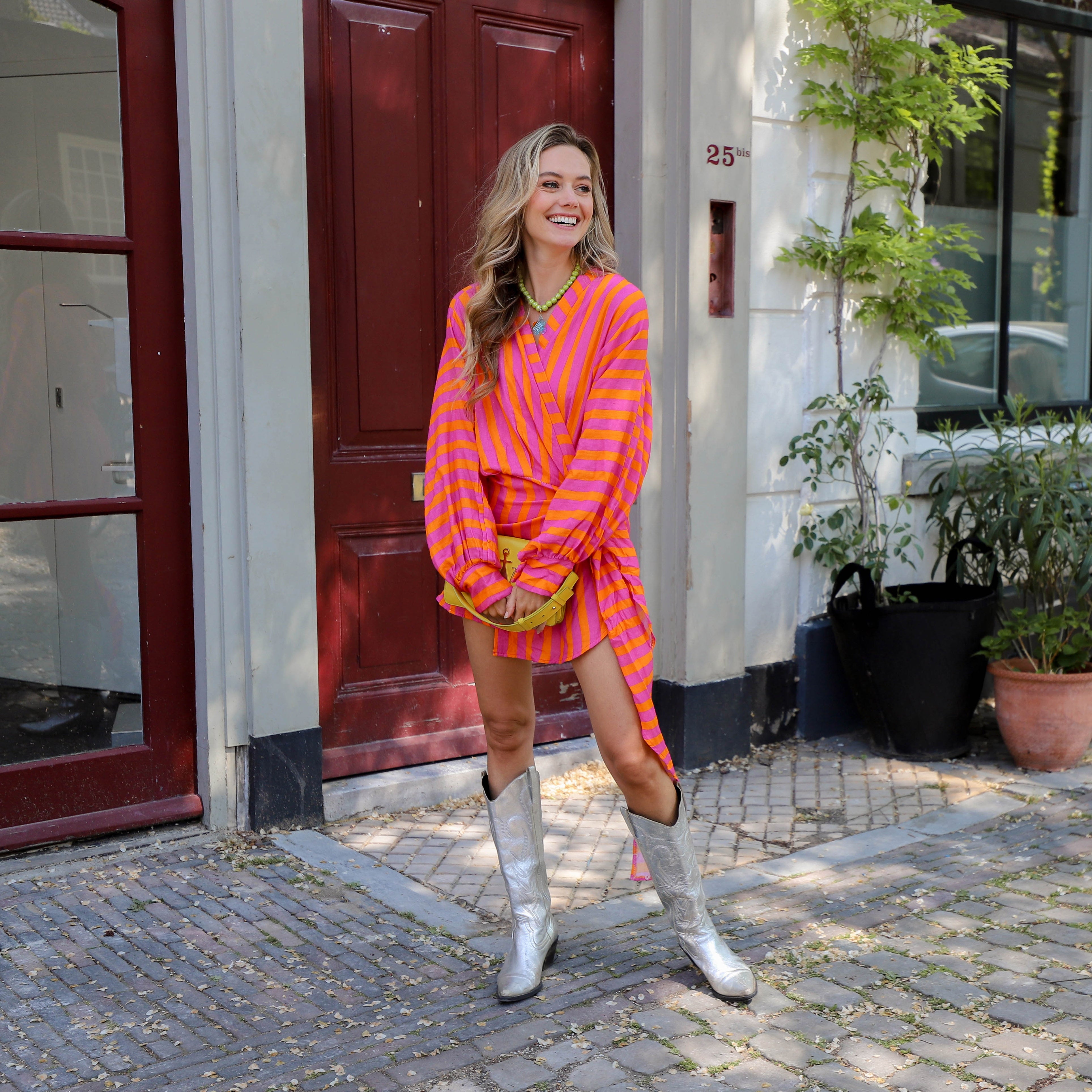 Deze opvallende wikkeljurk met oranje en roze strepen is een echte blikvanger! De speelse strepen geven de jurk een vrolijke en energieke uitstraling. De wikkelconstructie zorgt voor een flatterende pasvorm en een vrouwelijk silhouet. Je kunt de taille naar wens accentueren met de bijpassende strikceintuur. De lange mouwen maken deze jurk perfect voor zowel zonnige dagen als de wat koelere avonden.