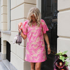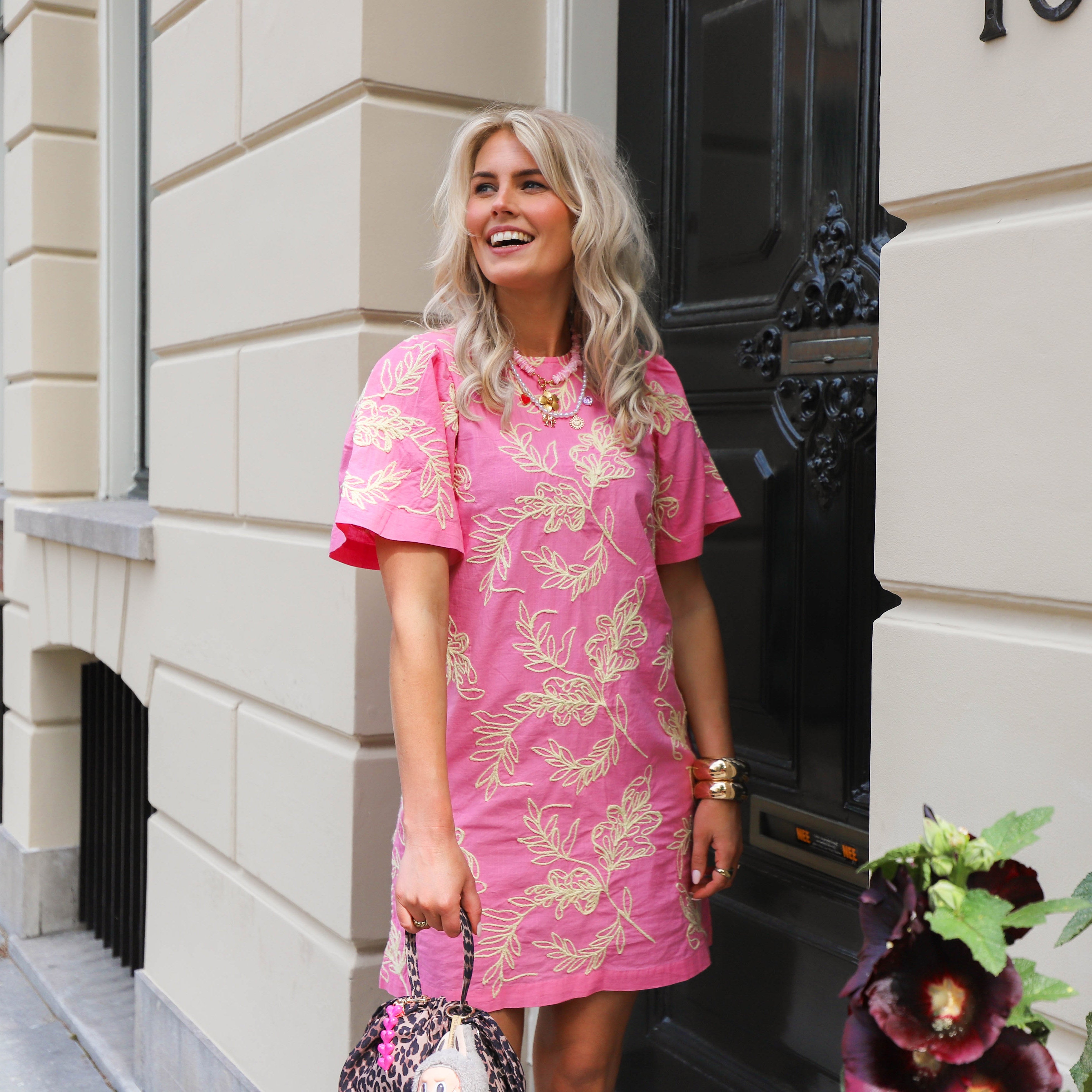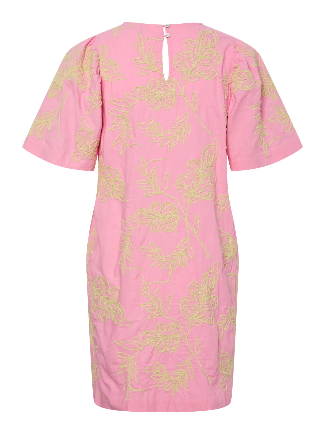 Deze vrolijke roze jurk is voorzien van een prachtig geborduurd bladerdessin in een frisse lichte kleur, wat zorgt voor een speelse en natuurlijke uitstraling. De jurk heeft charmante korte pofmouwtjes en een comfortabele pasvorm, perfect voor een zonnige dag. Gemaakt van biologisch katoen, is deze jurk niet alleen stijlvol, maar ook heerlijk zacht en ademend.