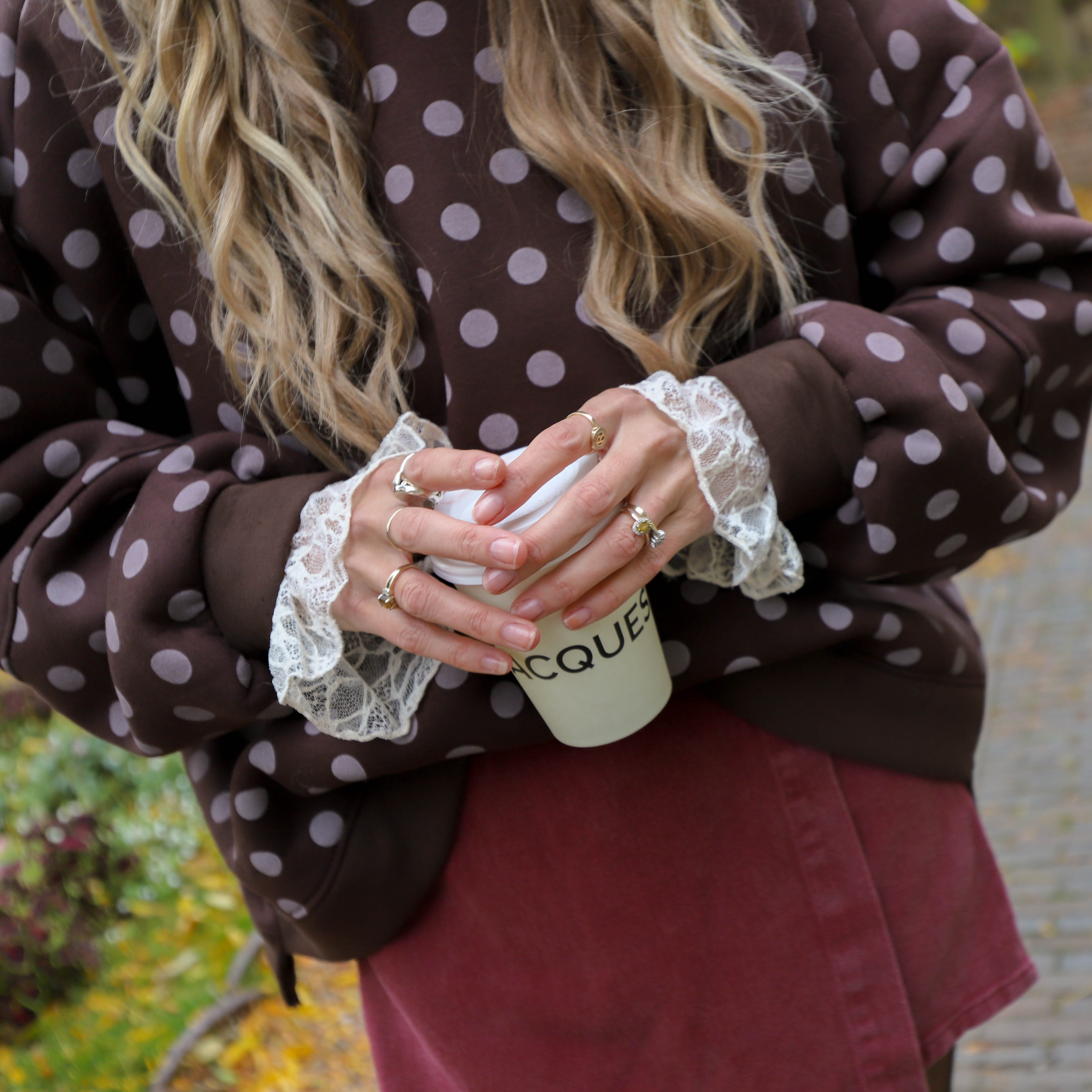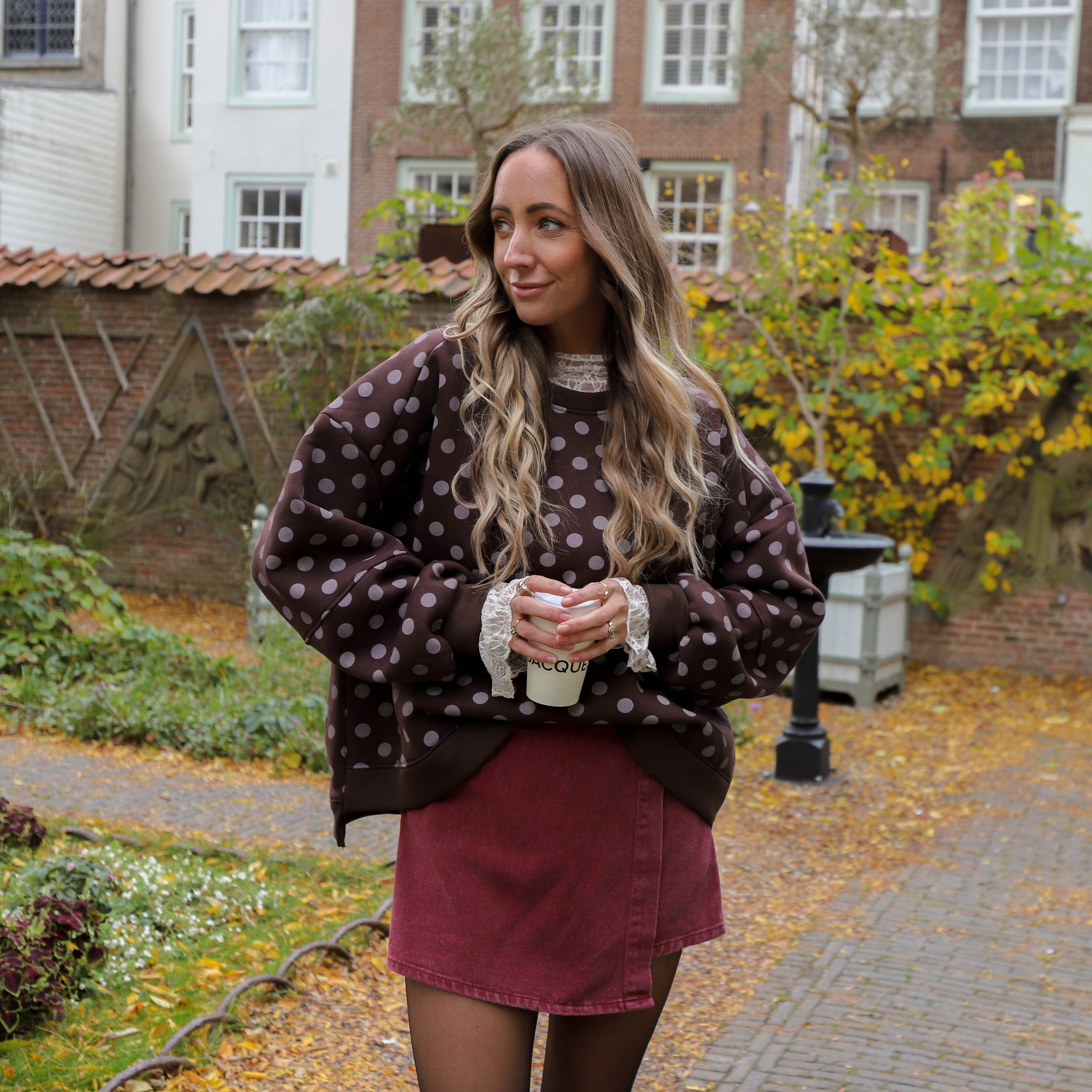 Deze Ruby Sweater is een heerlijke, zachte trui met een speelse, retro uitstraling. De sweater is uitgevoerd in een neutrale bruin kleur en bedekt met een all-over wit stippenpatroon. De oversized pasvorm, de ronde hals en de comfortabele, zachte stof maken dit de perfecte trui voor casual dagen. De subtiel gebogen, onafgewerkte zoom en de raglanmouwen geven het item een nonchalante vibe.