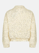 Jacket Becky is een echte eyecatcher voor dit seizoen. Dit vest is volledig bezet met glinsterende gouden pailletten en geeft elke look direct een feestelijke en luxe uitstraling. Het jasje heeft een rits aan de voorkant, een klassieke kraag en elastische boorden voor een comfortabele fit. Perfect om te dragen als statement piece bij een simpele outfit of juist als finishing touch bij een feestelijke look. De mouwlengte is 52 cm en de bodylength is 58 cm bij maat S.