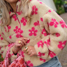 Deze heerlijk zachte en speelse Teddy Fleece Trui is de perfecte trui om je warm en vrolijk te houden. De trui is gemaakt van een zachte, crèmekleurige teddy fleece stof en is voorzien van een opvallend, all-over patroon van felroze bloemen. De hoge kraag met korte ritssluiting, de comfortabele buidelzak aan de voorkant en de elastische boord aan de onderkant geven deze trui een casual en behaaglijke look.