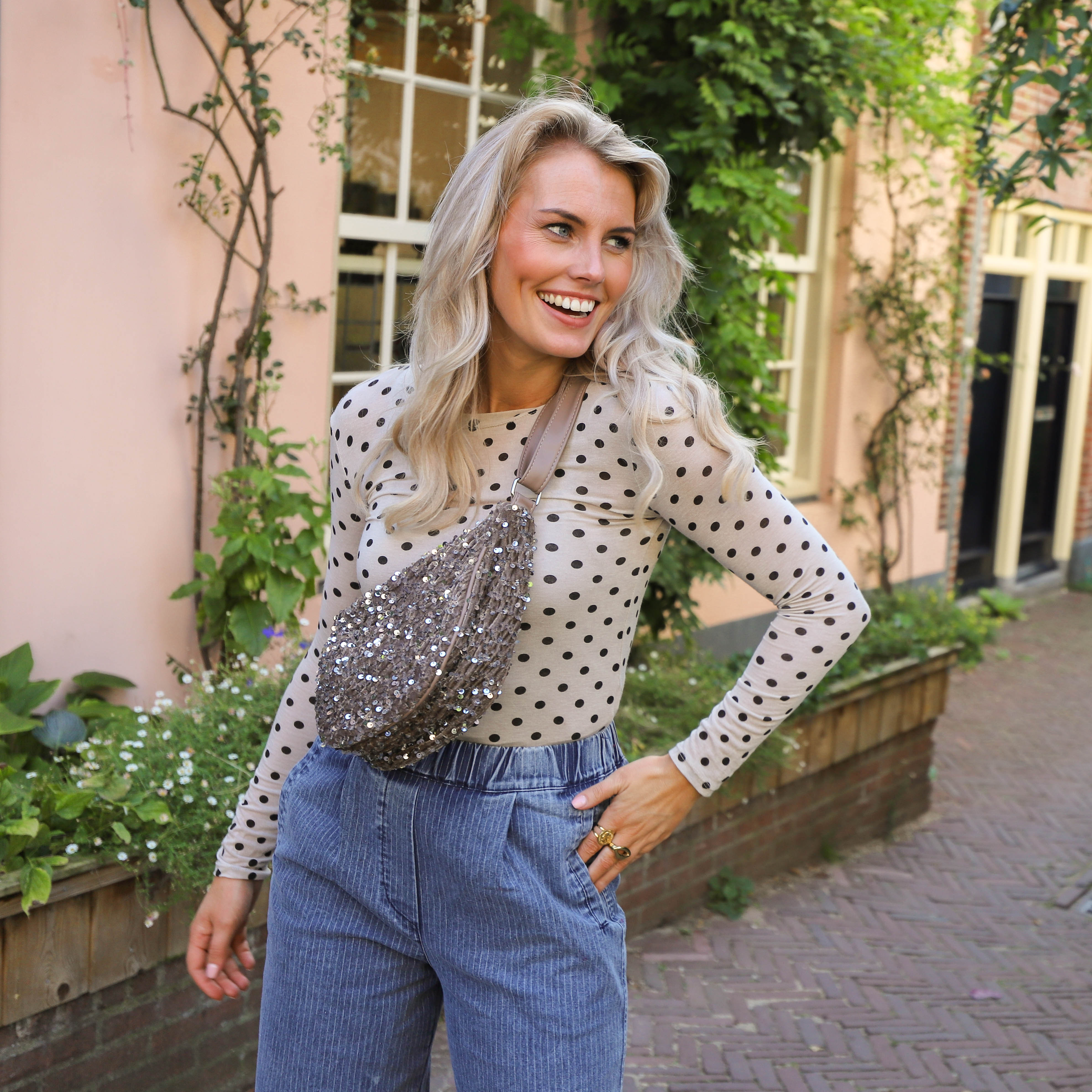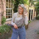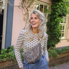 Deze zachte, beige trui is een stijlvolle en veelzijdige toevoeging aan je garderobe. De trui heeft een klassieke ronde hals en is voorzien van een speels stippenpatroon in een donkere kleur. Dankzij het lichte en comfortabele materiaal is deze trui perfect om te dragen als basislaag of als stijlvolle top. De subtiele transparantie van de stof geeft het een elegante touch.