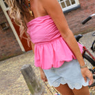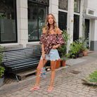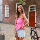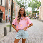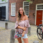 Upgrade je zomergarderobe met deze prachtige 'broderie' denim shorts in een lichte denim kleur. Wat deze short echt uniek maakt, zijn de delicate broderie details en de golvende randen aan de onderkant, die een vrouwelijk en speels tintje geven.