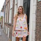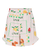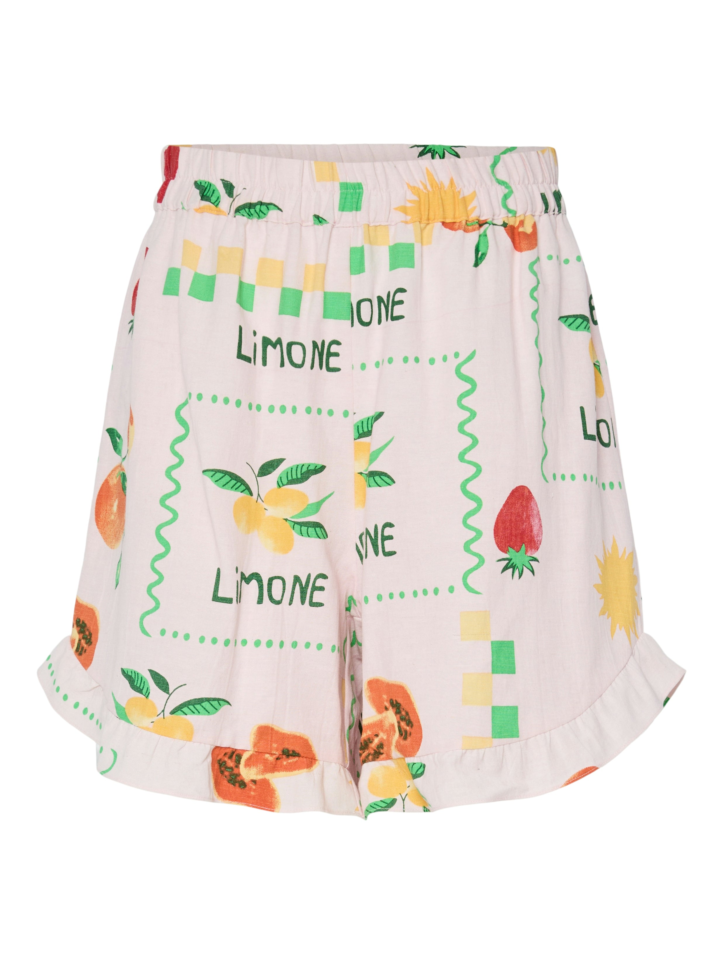 Deze "pclimone he shorts wvn kca" zijn vrolijke en trendy shorts met een print van citroenen, aardbeien en andere vruchten en kleine ruches aan de onderkant.
