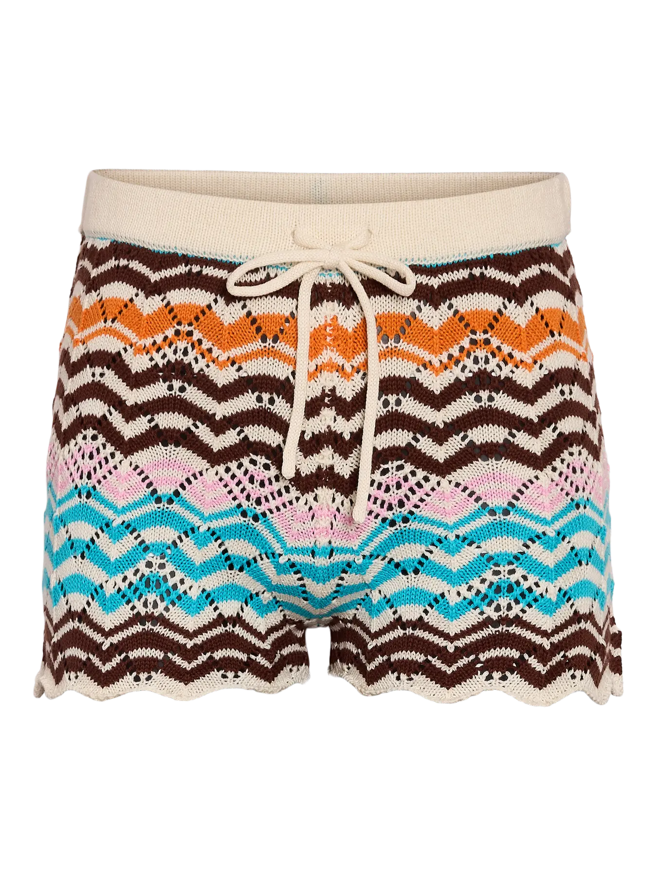 Deze kleurrijke NM Daniella MW Micro Knit Shorts is een vrolijke toevoeging aan je zomergarderobe! De short heeft een opvallend ingebreid patroon in beige, oranje, roze, blauw en bruin, wat zorgt voor een unieke en speelse uitstraling. De elastische tailleband met trekkoord maakt deze short heerlijk comfortabel en perfect voor warme dagen.