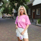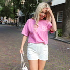 Mooi shortje in een scubastof in het wit. Het shortje heeft een witte bies aan de zijkant met sterrenprint. Het shortje heeft twee zakken aan de voorkant en staat leuk met een roze shirtje.