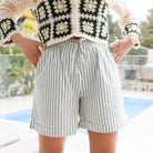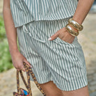 Mooie short in een lichte kleur met streepjesprint. De short heeft een hoge taille en staat leuk met het bijpassende topje.