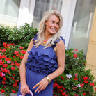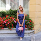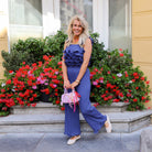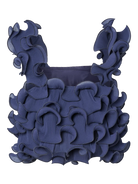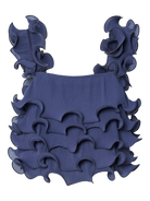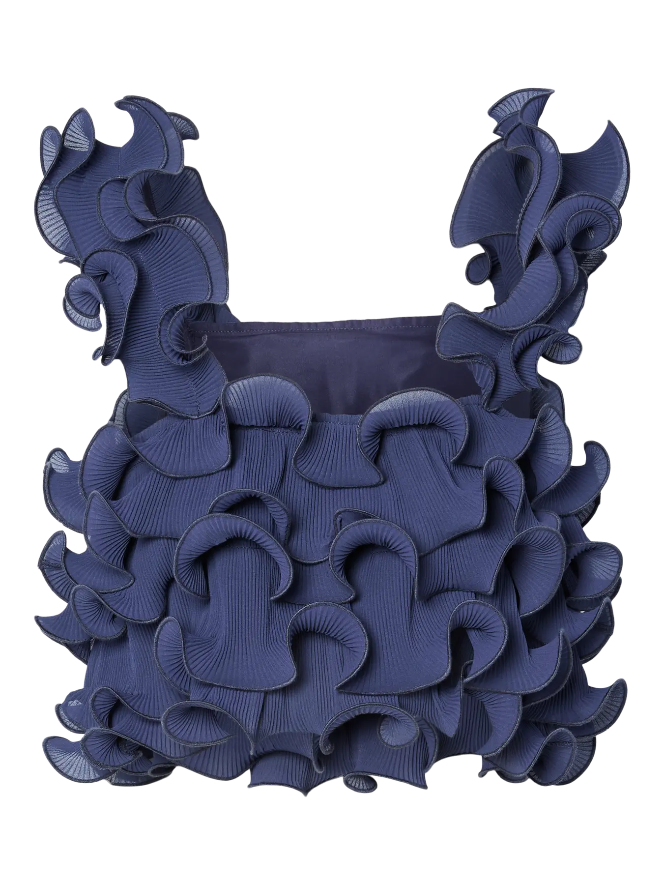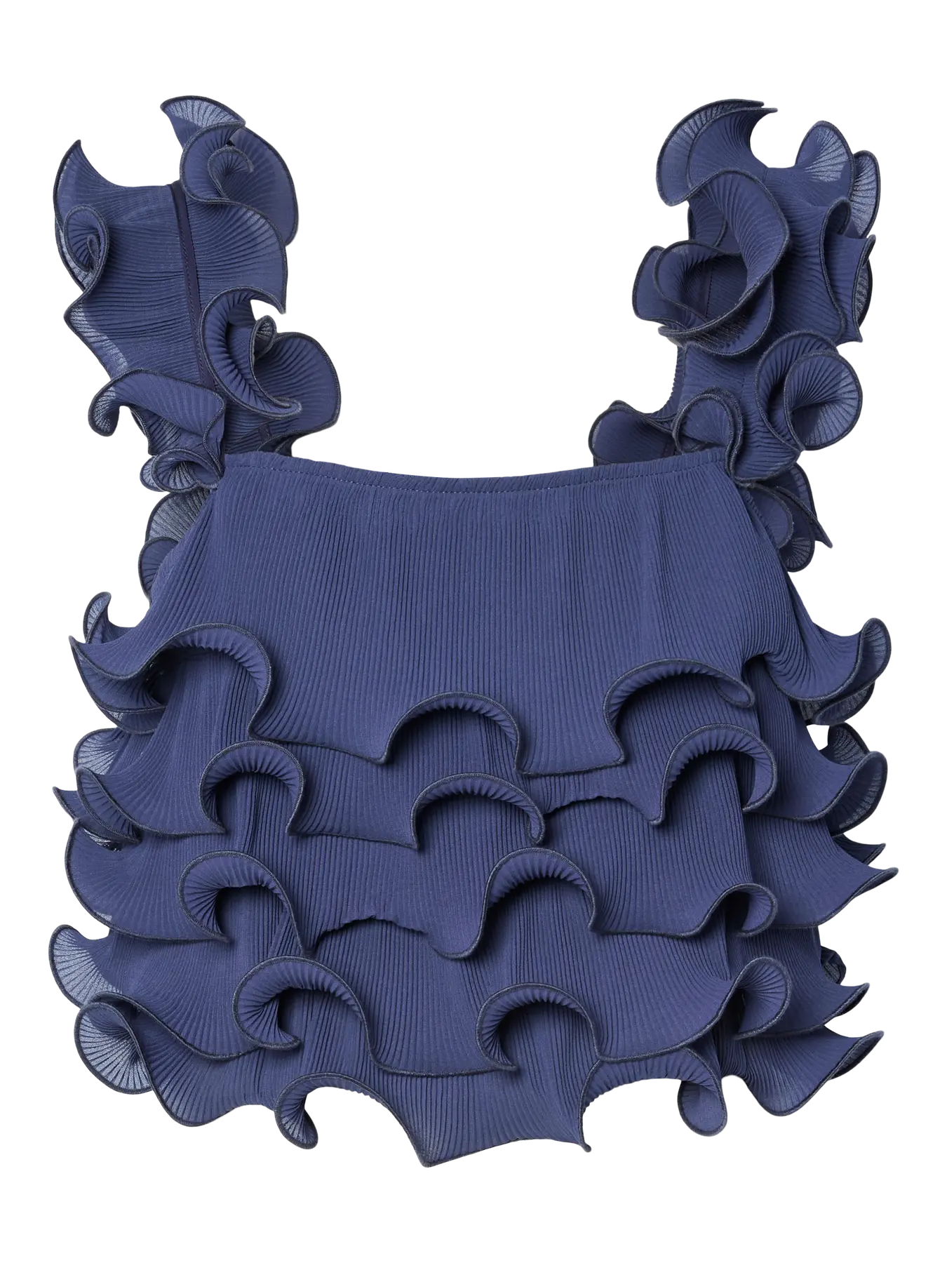 Mooie donkerblauwe short strap top met opvallende ruches en een geplooide textuur. Deze speelse top is perfect voor een zomerse dag of een feestelijke gelegenheid.