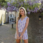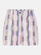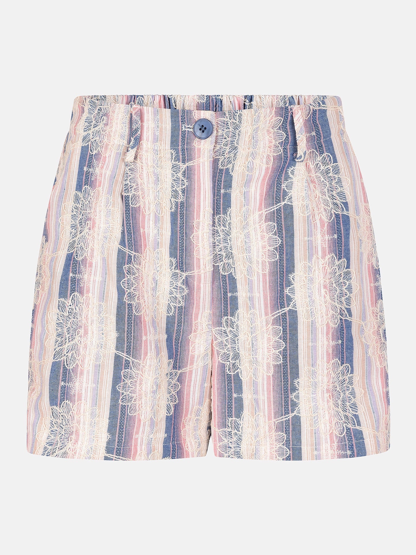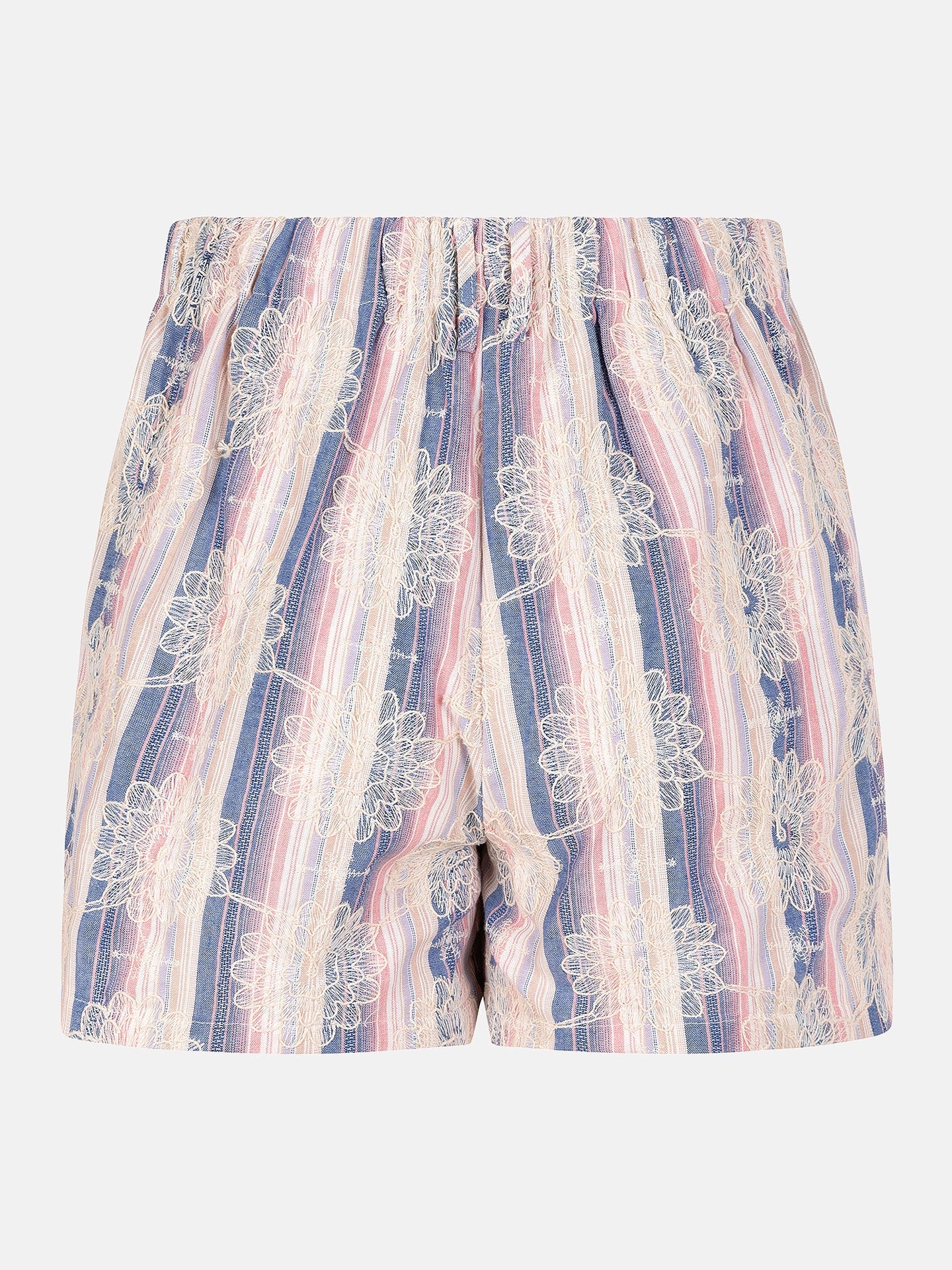 Short Andrea is een stijvol short. De stof wordt verrijkt met een verfijnd wit borduurpatroon, wat een luxe en bohemian uitstraling geeft. De short heeft een elastische tailleband aan de achterzijde, steekzakken aan de voorzijde en sluit met een rits en knoopsluiting.
