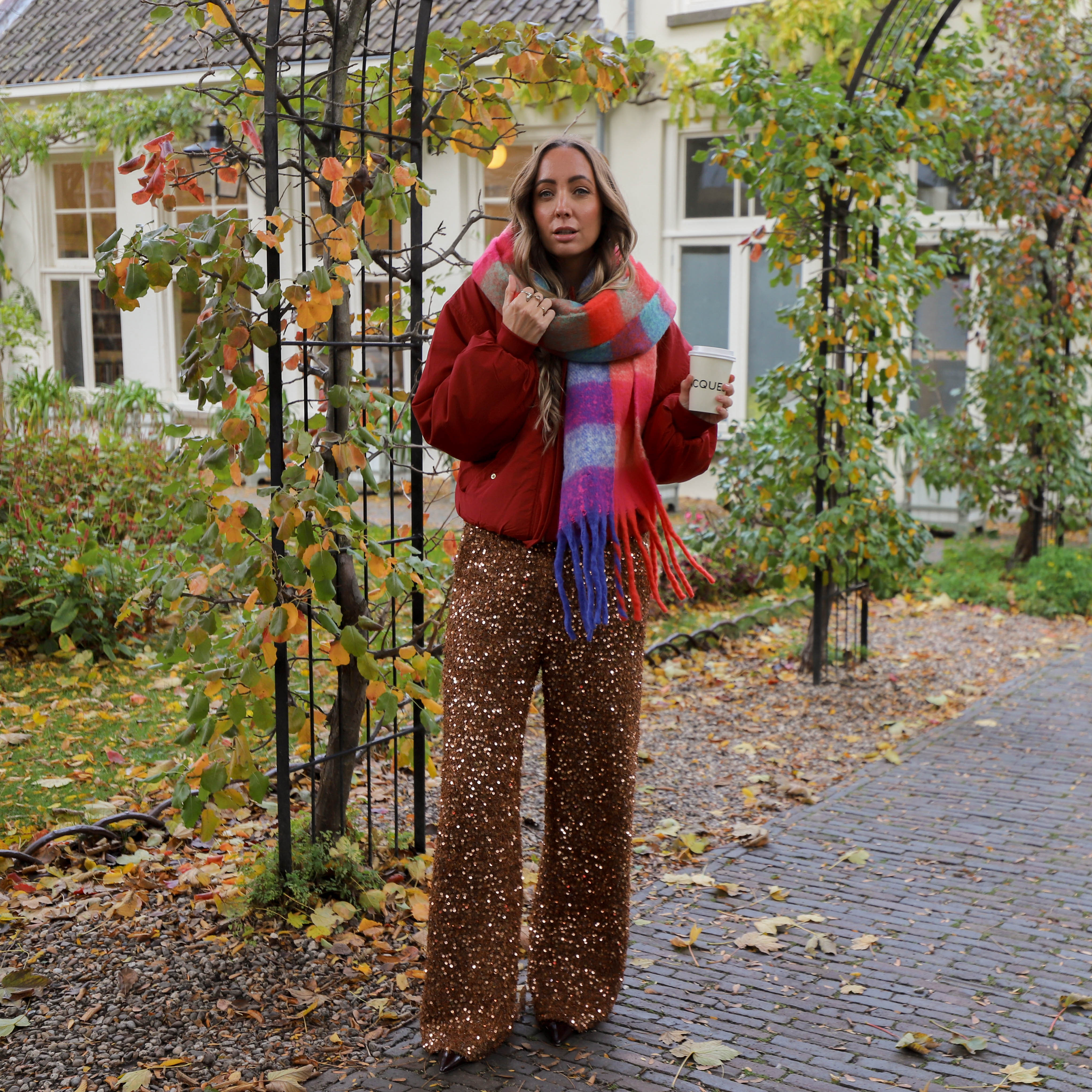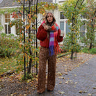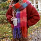Deze pc Jina Long Scarf is een opvallende en heerlijk zachte sjaal die direct een kleur boost geeft aan je winterjas. De sjaal is uitgevoerd in een tweedelig design: de ene helft heeft een levendige, effen roze-oranje melange, terwijl de andere helft een grof ruitpatroon heeft in paars, blauw en fuchsia. De pluizige, brushed textuur en de franjes aan de onderkant maken deze sjaal extra behaaglijk en stijlvol.