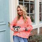 Deze gestreepte trui is een speels en opvallend item met een frisse en energieke uitstraling. De combinatie van soft pink en oranje strepen geeft de trui een vrolijke en zomerse look, terwijl de zachte stof zorgt voor een comfortabel draaggevoel. De wijde pasvorm en verlaagde schouders creëren een relaxte en nonchalante fit.