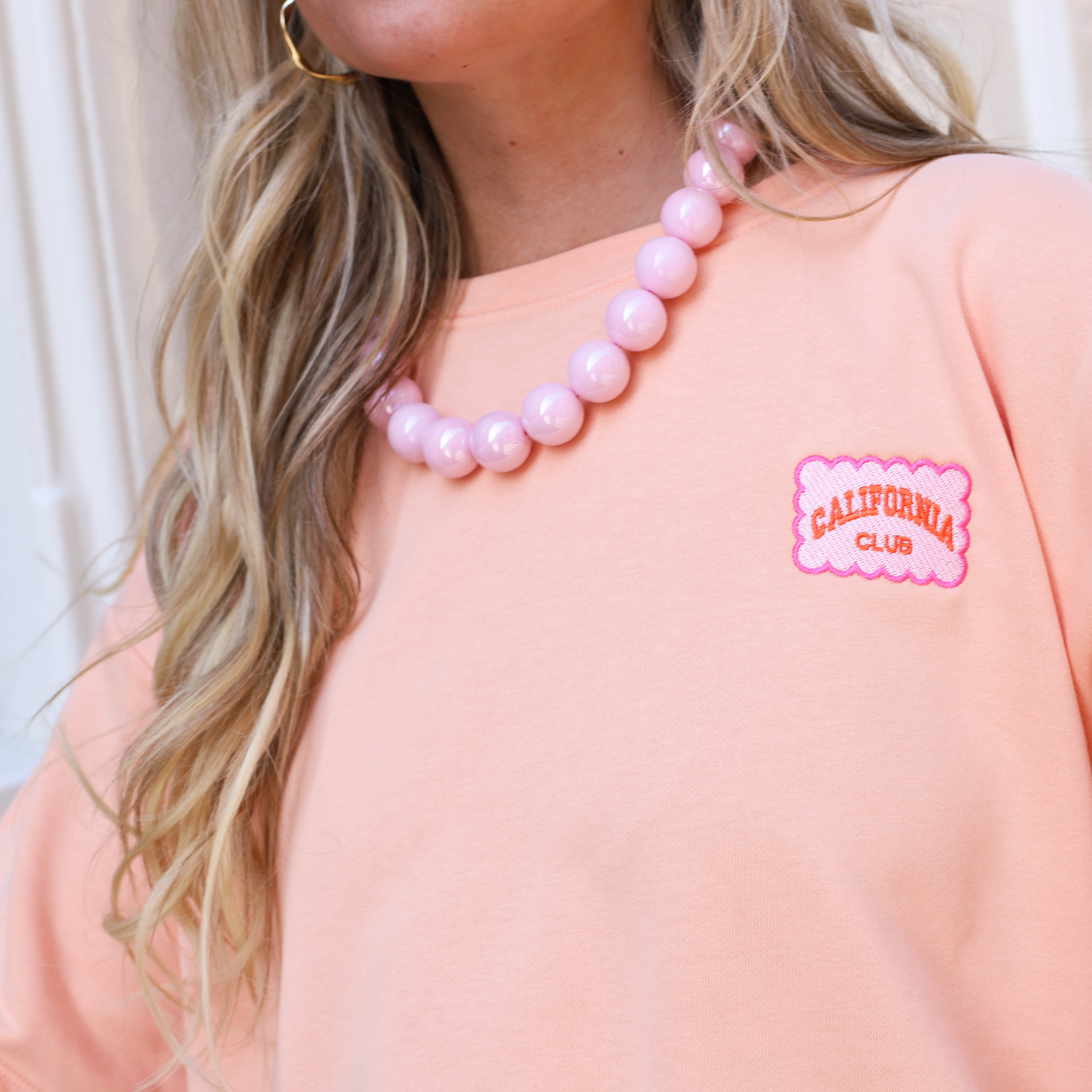 Deze sweater is een zacht en comfortabel item met een frisse en zomerse uitstraling. De perzikkleurige tint geeft het geheel een warme en vrolijke look, terwijl de subtiele “California Club” patch op de borst zorgt voor een speels en stijlvol detail.