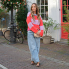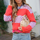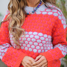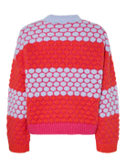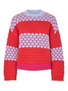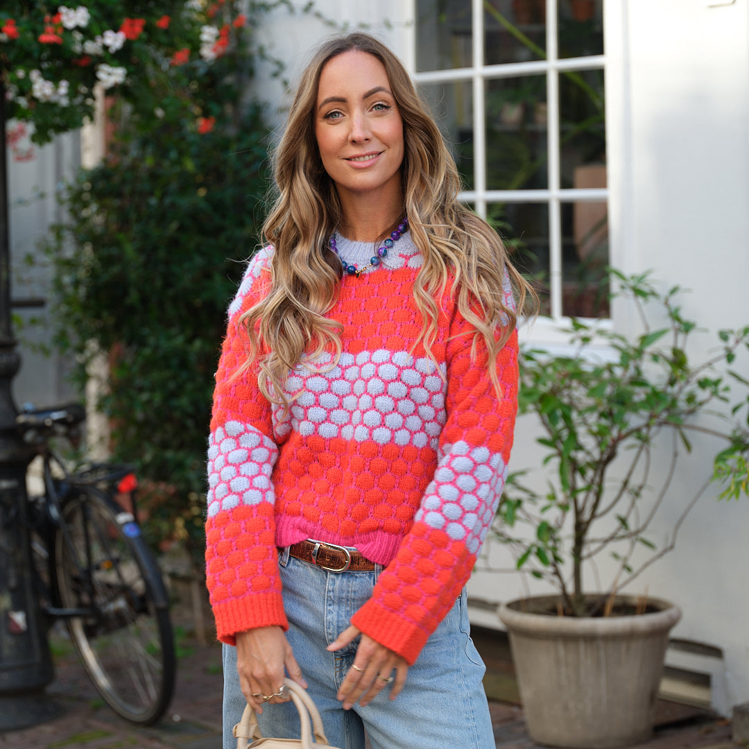 Deze vrolijke, gebreide trui (pcjanel ls o-neck knit bc) is een kleurrijke eyecatcher. De trui combineert een felle oranjerode basis met een lichtblauwe honingraat- of bobbelsteek in horizontale strepen, wat zorgt voor een speelse textuur en patroon. De afwerking met een roze ribboord onderaan geeft een extra kleuraccent. De trui heeft een klassieke ronde hals en een wijde, boxy fit.