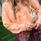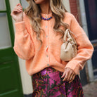 Dit vrolijke Peggy vest in een heldere peach kleur is een heerlijk zachte en opvallende toevoeging aan je collectie. Het vest heeft een licht pluizige textuur. Het vest heeft een klassieke ronde hals, een knoopsluiting met lichte knoopjes en een wijde, boxy fit.