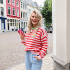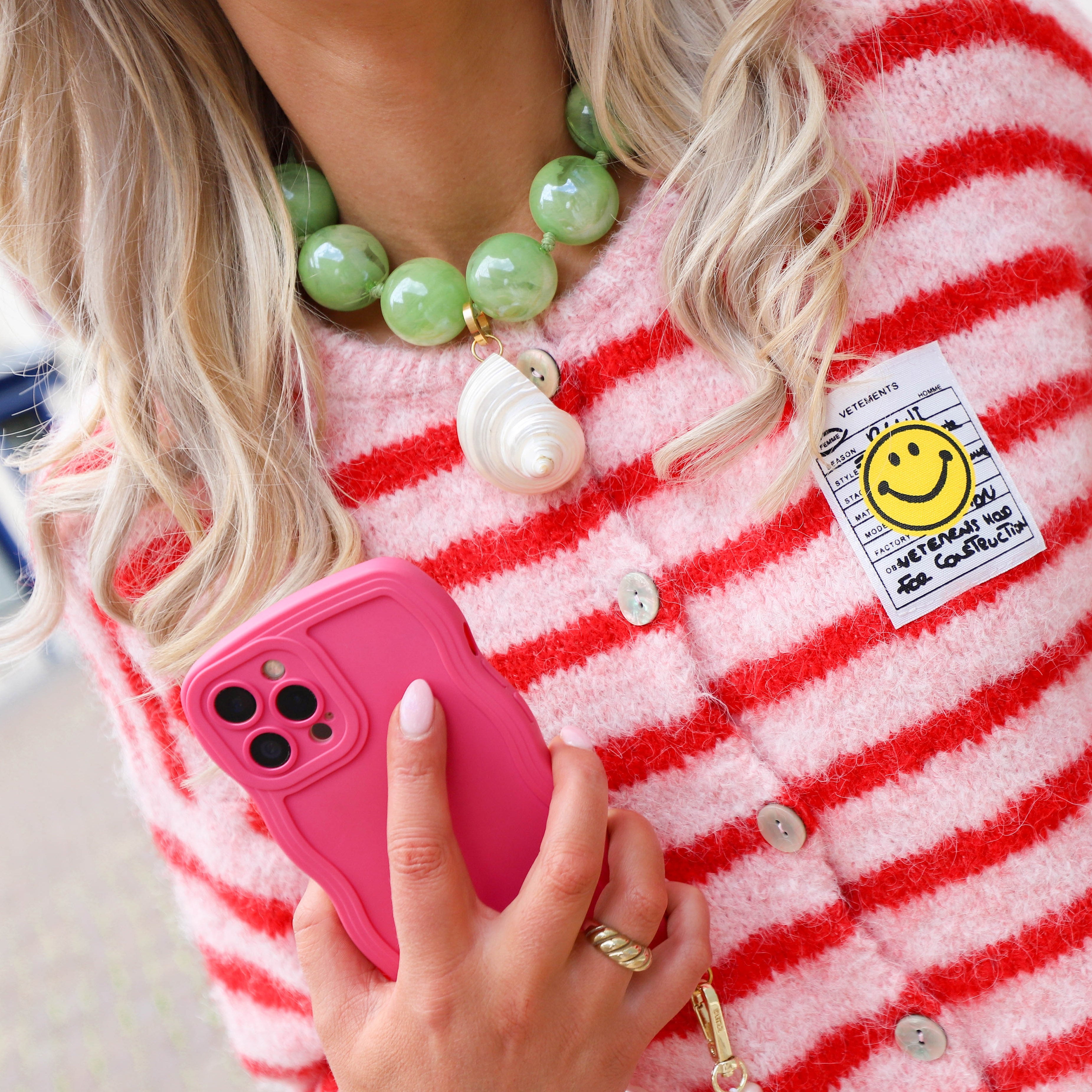 Het vest is uitgevoerd in een speels gestreept patroon van zonnig geel en zacht roze, verrijkt met een pluizige textuur die zorgt voor een comfortabel en knus gevoel. De subtiel glanzende knoopjes en de vrolijke smiley-badge aan de zijkant voegen een unieke en leuke touch toe.