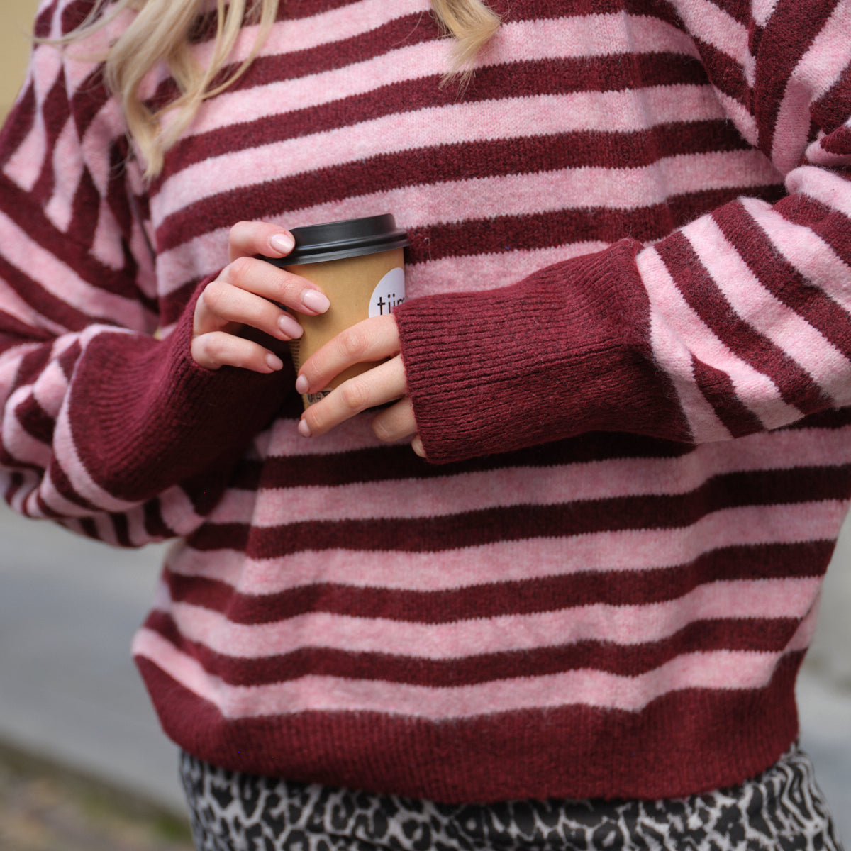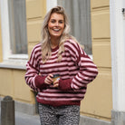 Deze Streep Trui is een heerlijk zachte en oversized trui met een knusse uitstraling. De trui combineert brede strepen in zachtroze en diep bordeauxrood, wat zorgt voor een rijke en warme kleurencombinatie. De fluffy knit, de ronde hals en de relaxte pasvorm maken dit de perfecte trui voor de koude dagen. Style 'm met een donkere jeans en laarzen voor een comfortabele, maar trendy look.
