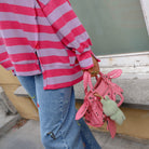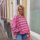 Dit comfortabele sweatshirt is de perfecte mix van casual en stijlvol. De trui heeft een opvallende gestreepte print in roze en lila, en de zachte sweaterstof voelt heerlijk aan op de huid. De relaxte pasvorm met verlaagde schoudernaden en de ronde halslijn maken het shirt ideaal voor een ontspannen en trendy look. De zijkanten hebben kleine splitjes voor extra bewegingsvrijheid.