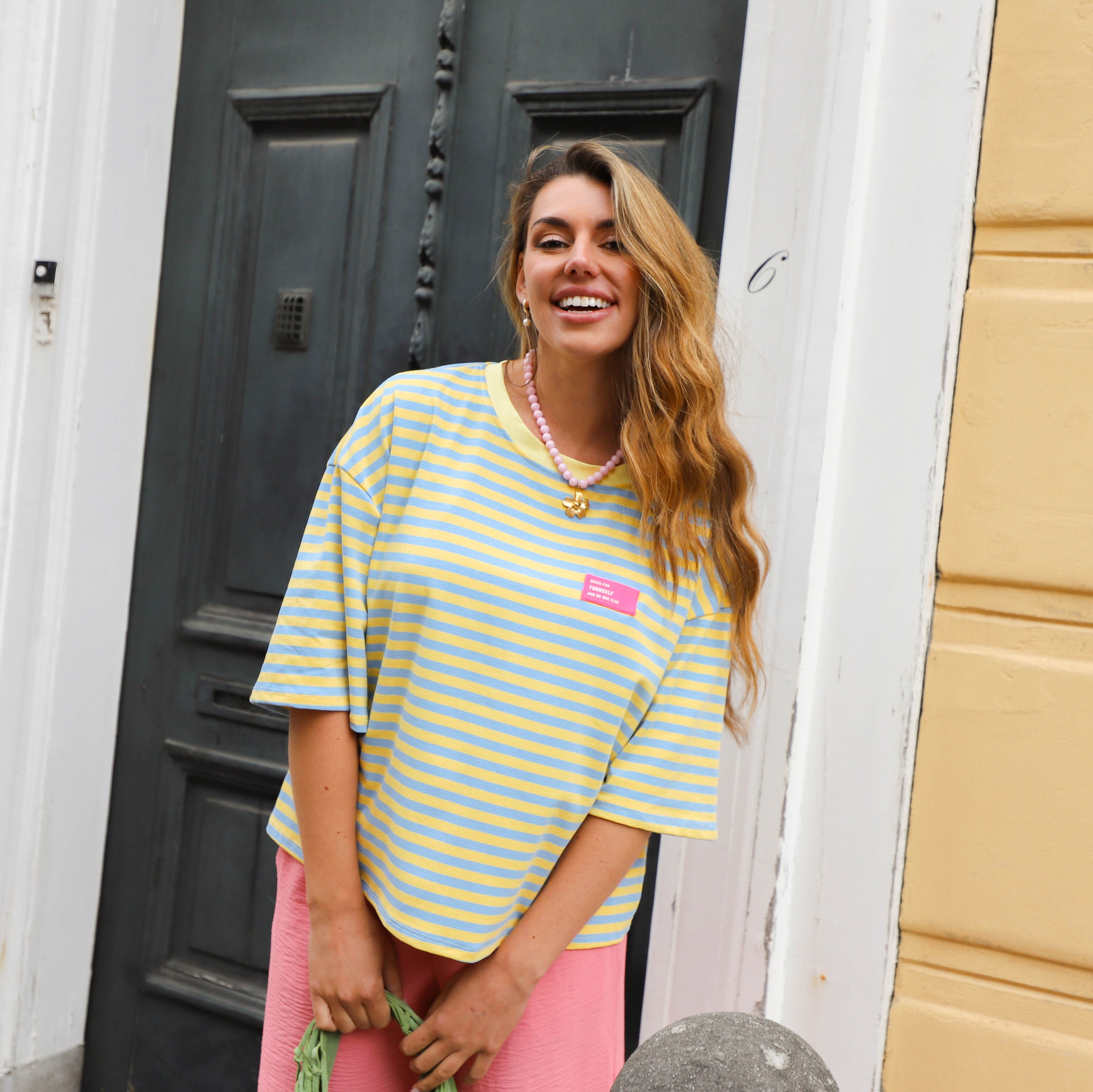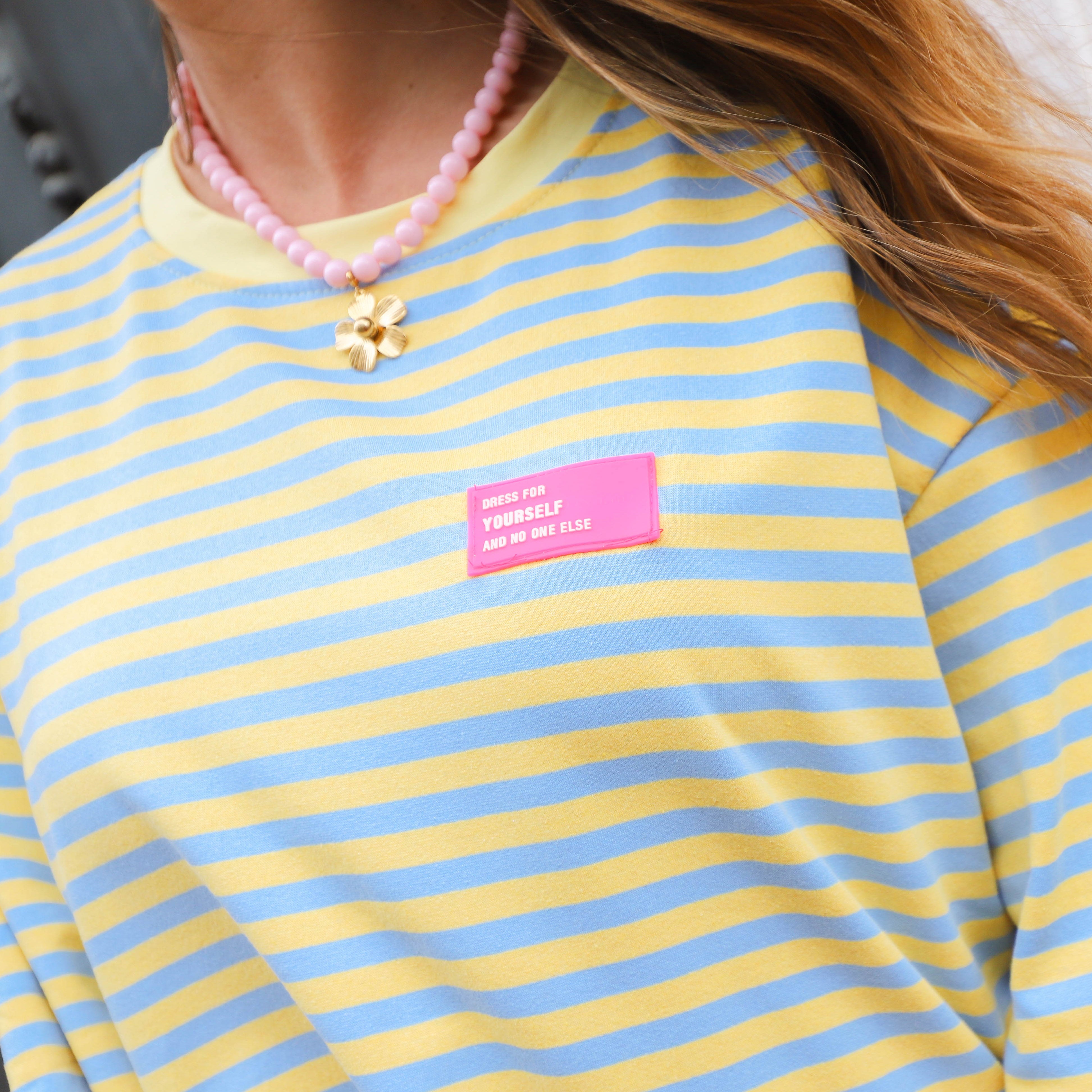 De top is uitgevoerd in een speelse combinatie van blauwe en gele strepen, wat zorgt voor een frisse en zomerse uitstraling. Het shirt heeft een comfortabele pasvorm met 3/4 mouwen en een ronde halslijn, perfect voor een casual maar stijlvolle look.