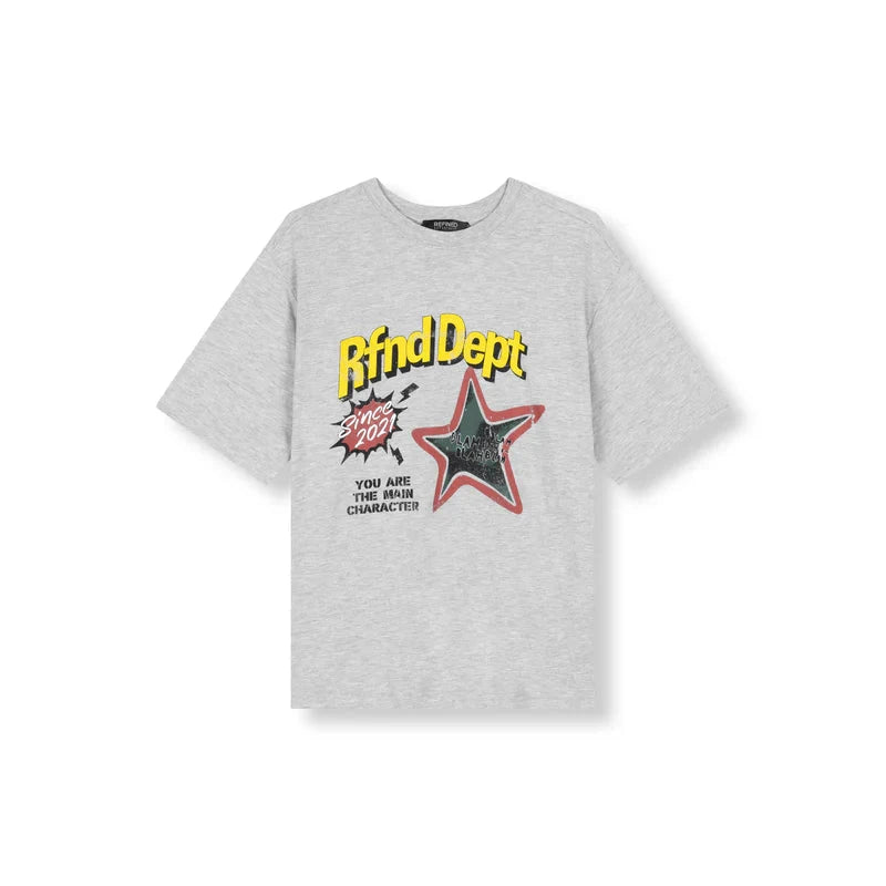 Geef je casual look een upgrade met dit leuke grijze T-shirt. Dit T-shirt heeft een ronde hals en een grafische print aan de voorkant. De print, met teksten zoals 'Rfn Dept' en 'You are the main character', zorgt voor een stoere en eigenzinnige uitstraling.
