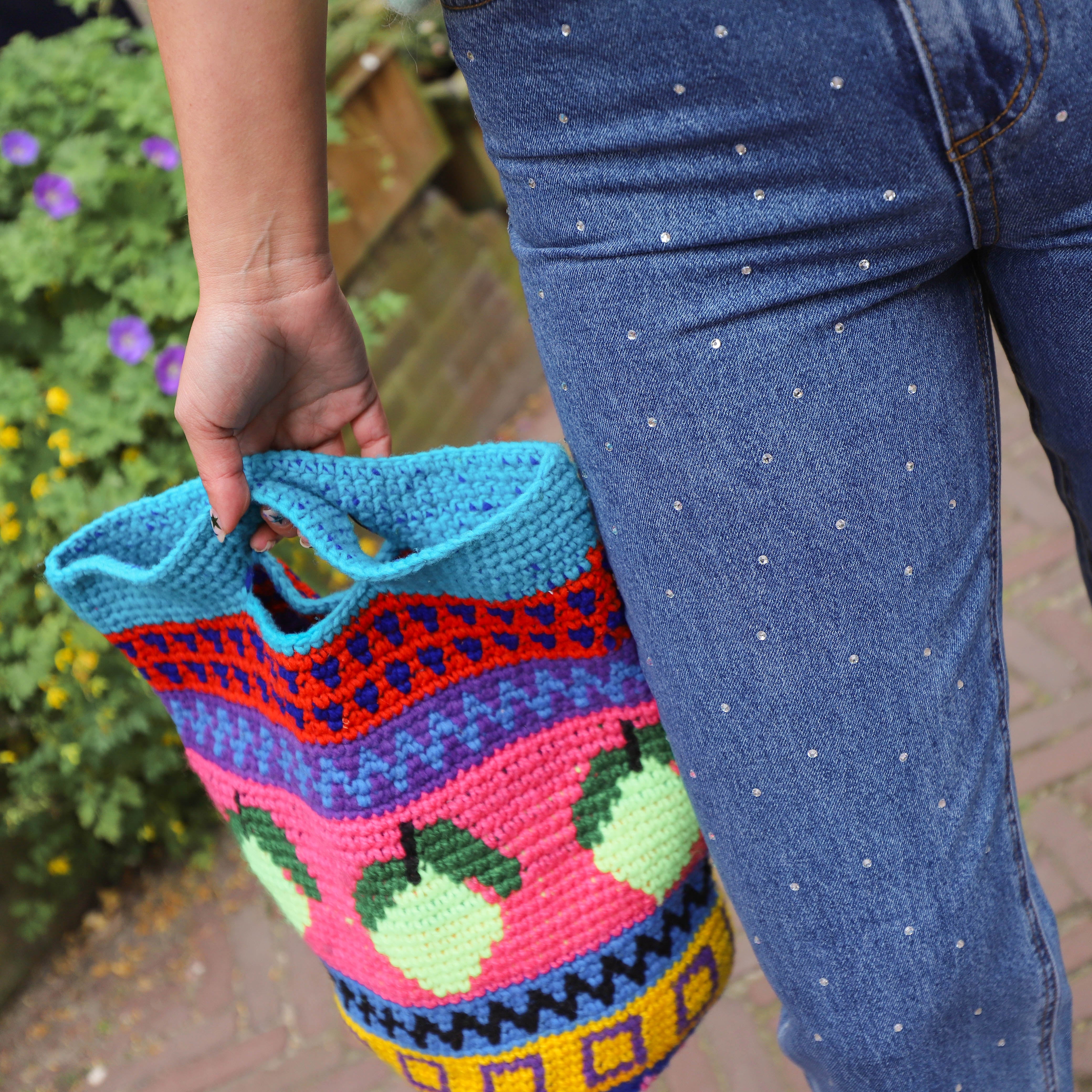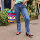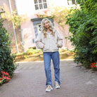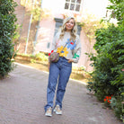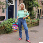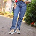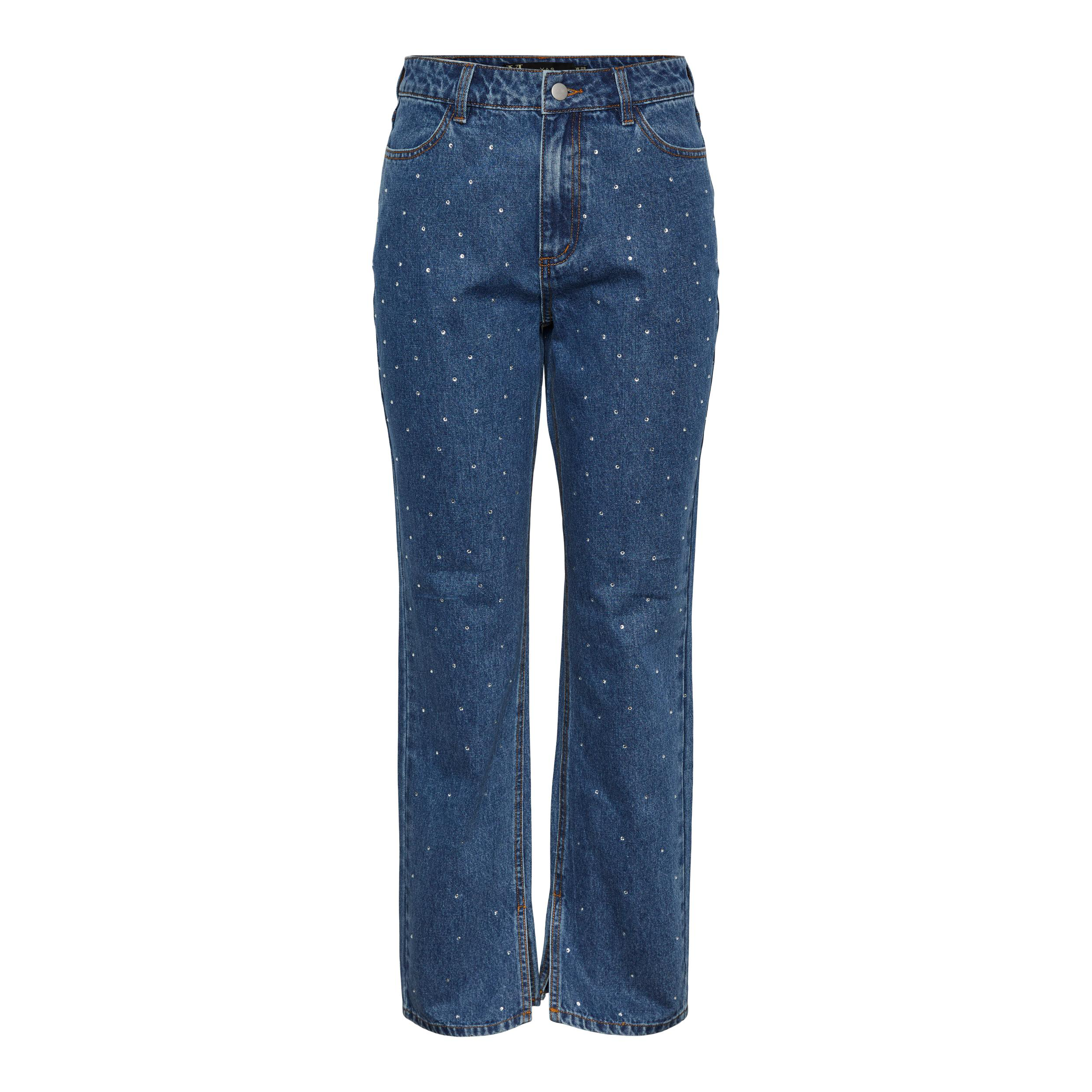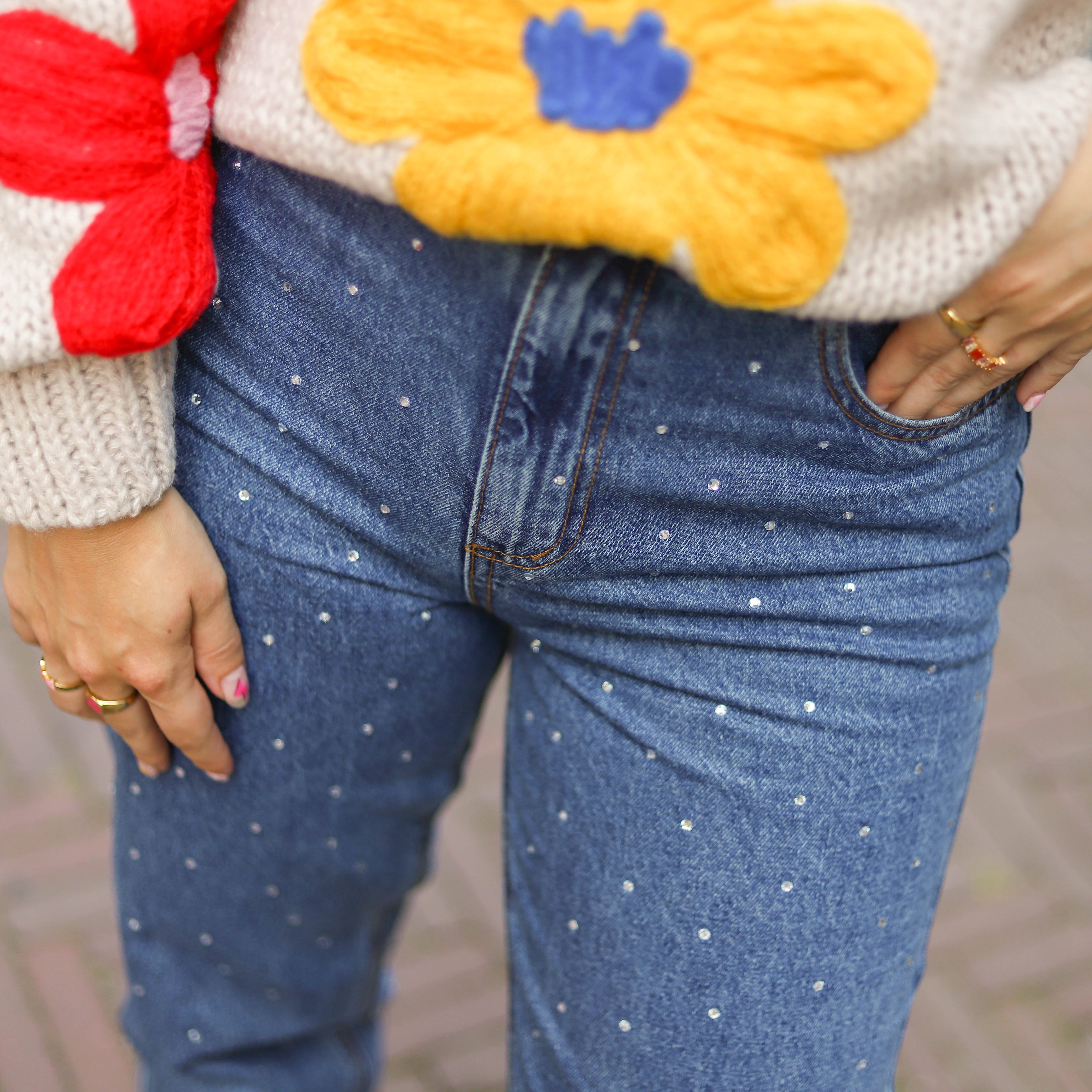 Mooie jeans met glitterstuds. De jeans heeft een hoge taille en brede pijpen. Combineer hem met een leuke trui.