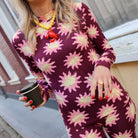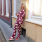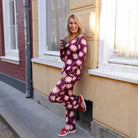 Deze "soft flared top soleil light" is een opvallende en trendy top met een donkerpaarse basis en een lichtroze met lichtgele zonprint. Leuk te combineren met de bijpassende legging of een andere broek.