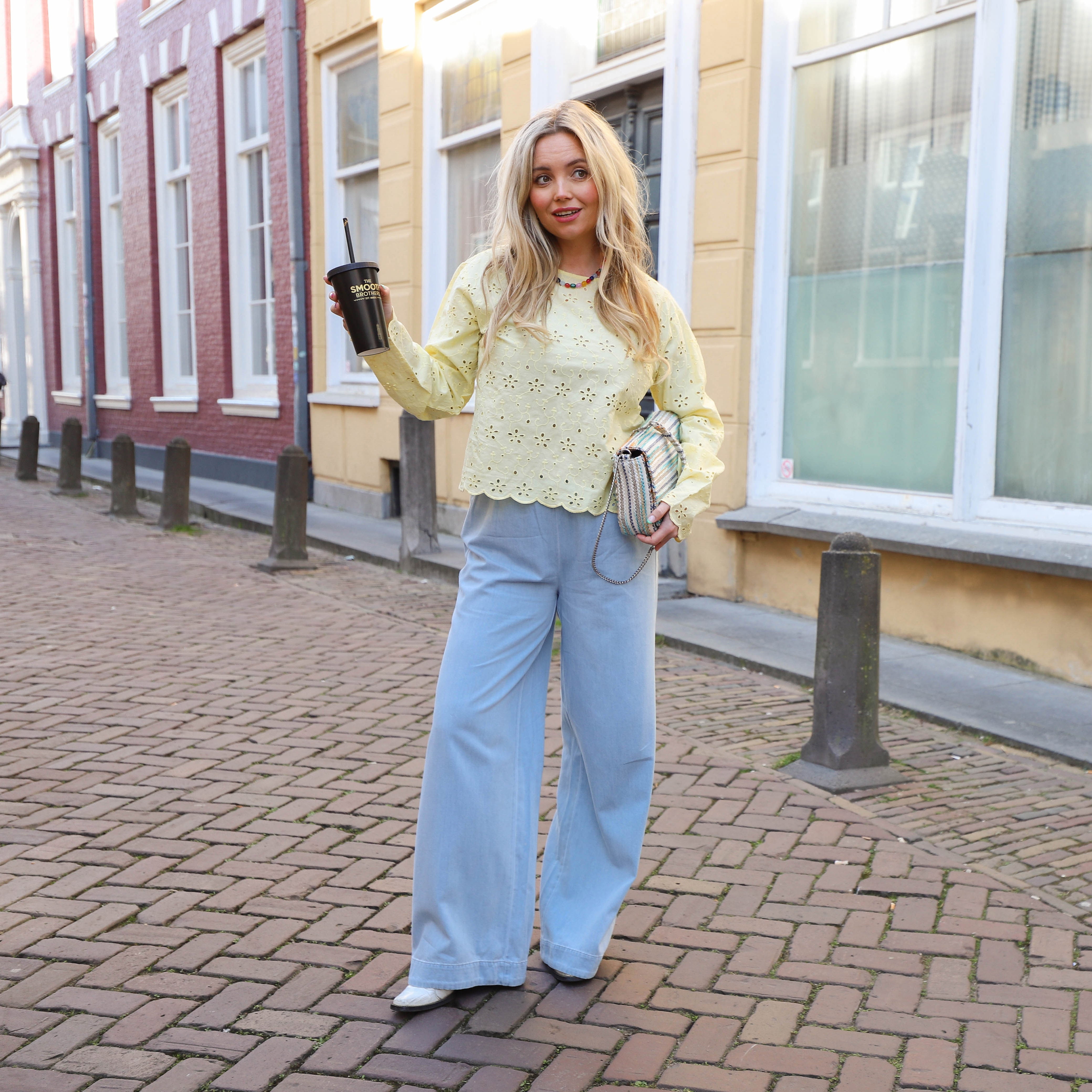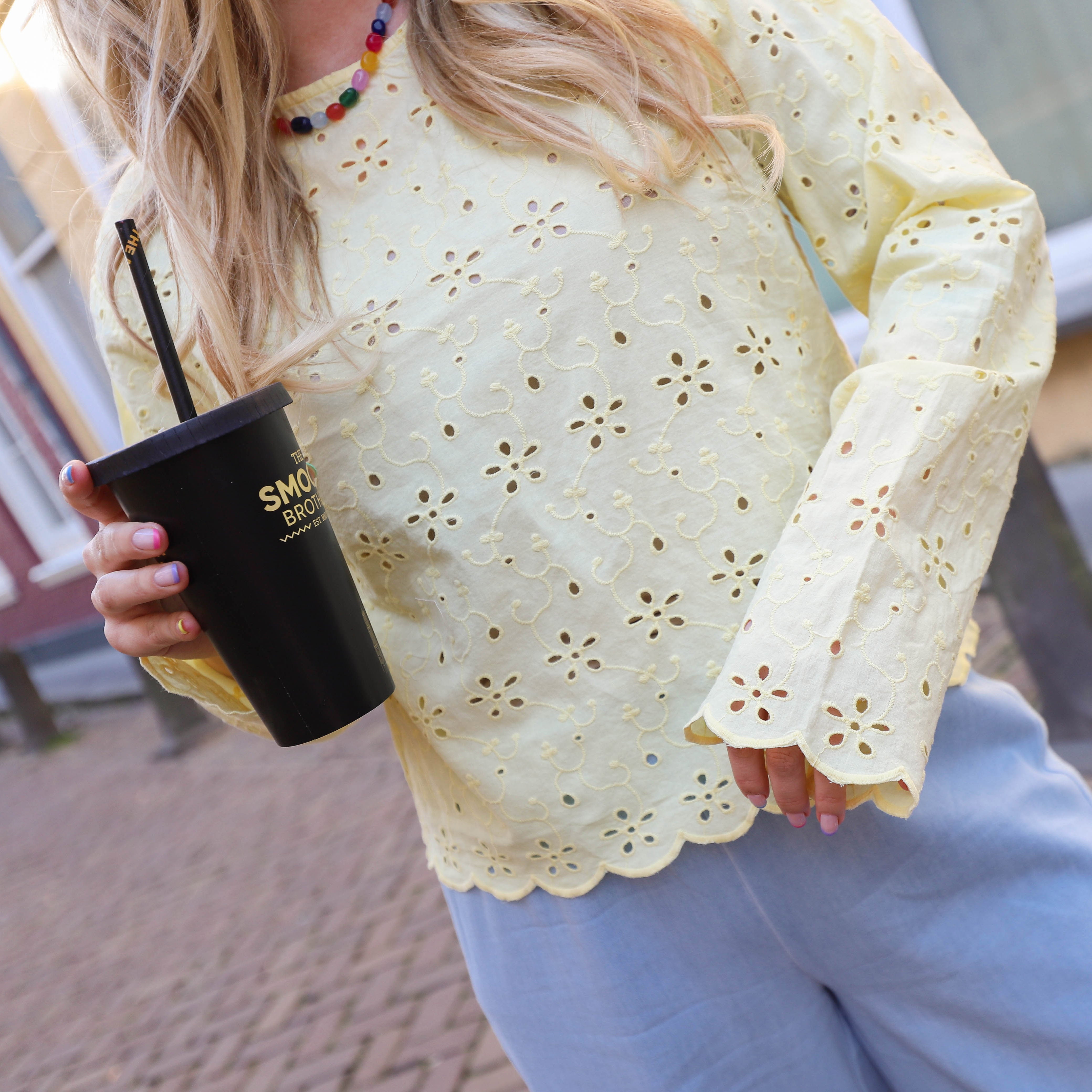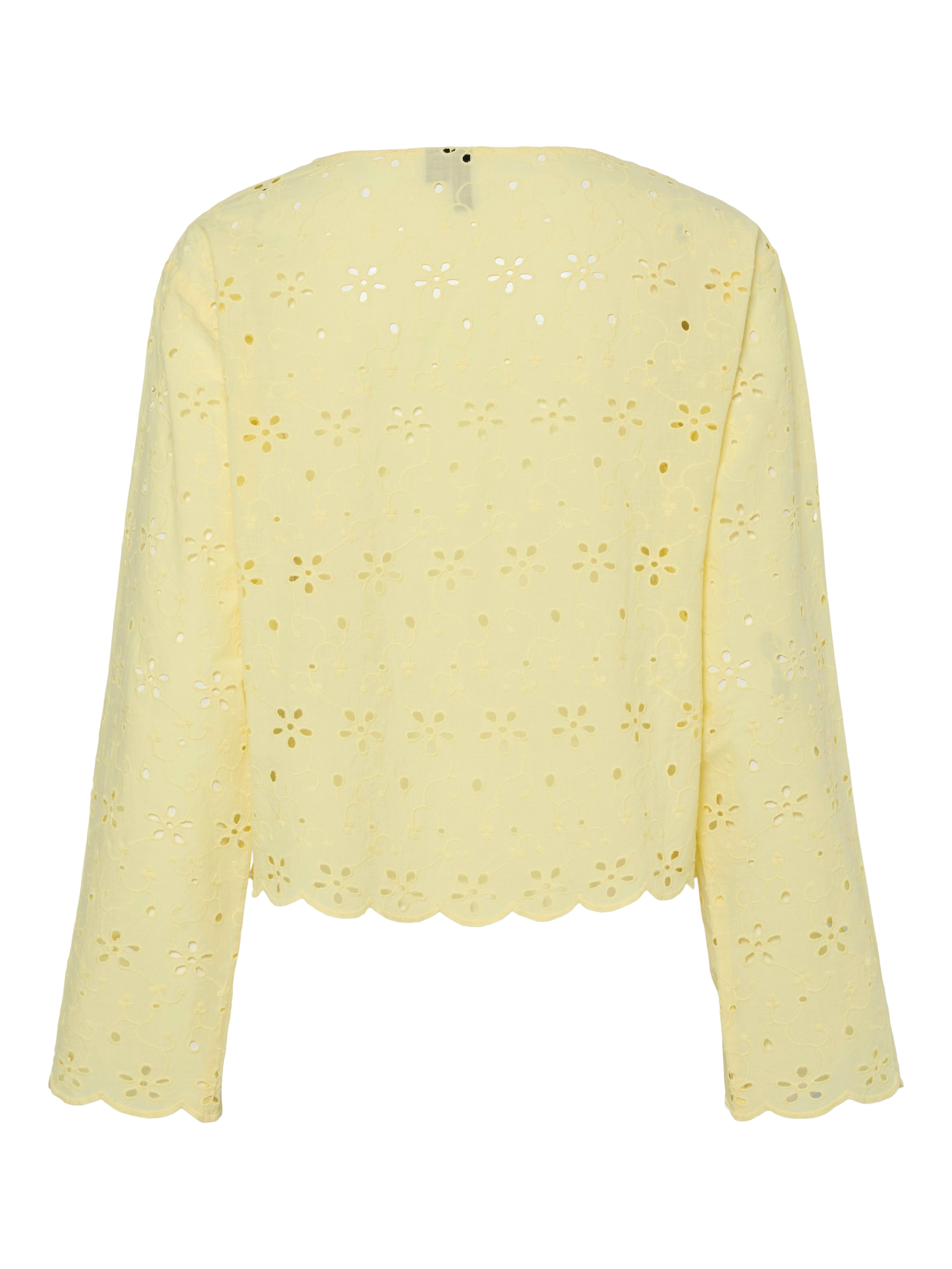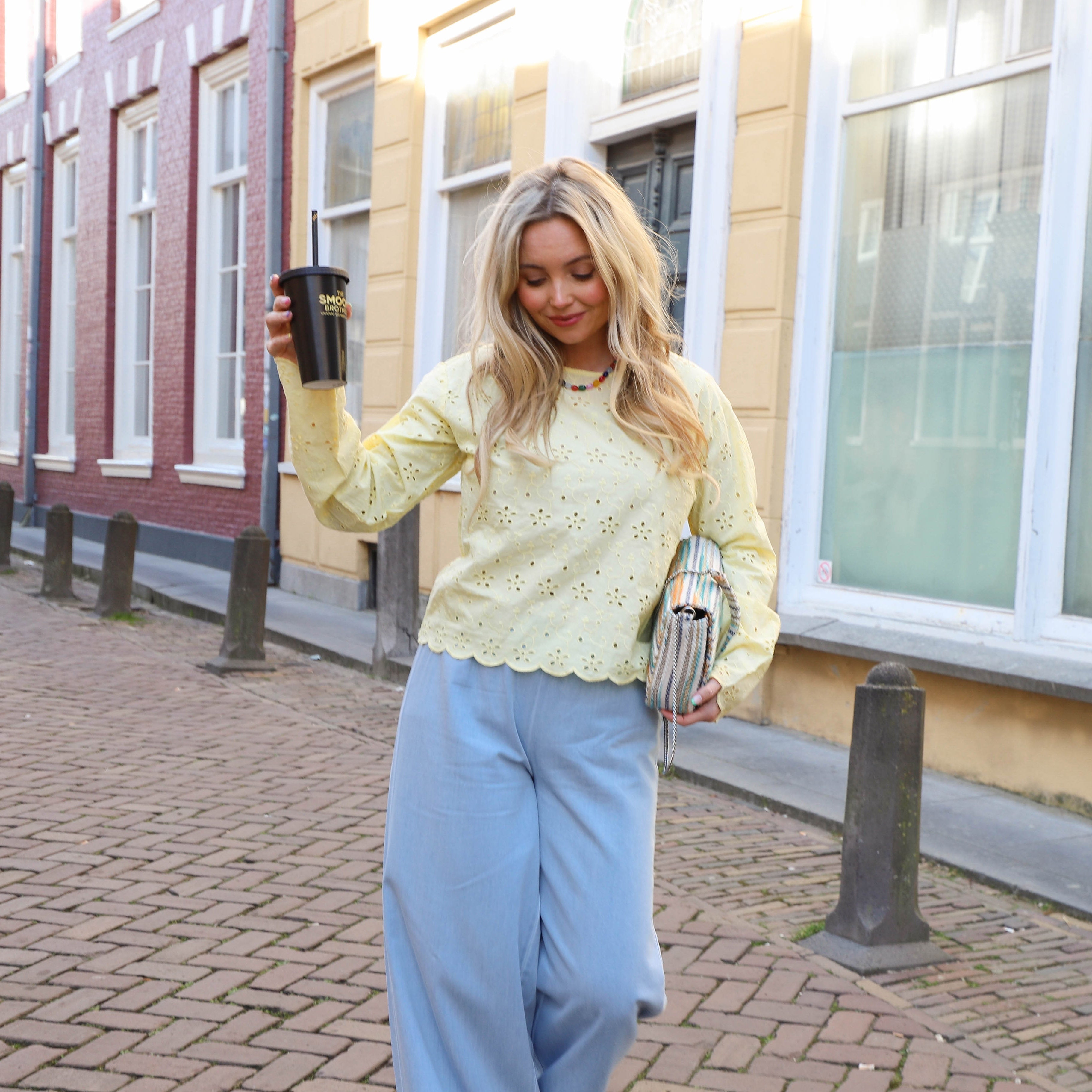 Mooie lichtgele broderie blouse. De wat wijdere blouse van kant heeft lange mouwen en een ronde hals. Staat leuk met een rok of jeans.