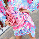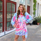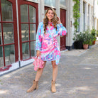 Deze vrolijke wikkeljurk met een unieke print in het roze is een echte eyecatcher! De soepele stof van een katoen-polyester mix valt mooi en draagt comfortabel. Door de wikkelsluiting kun je de pasvorm eenvoudig aanpassen. Perfect voor een zomerse dag of een feestelijke gelegenheid!