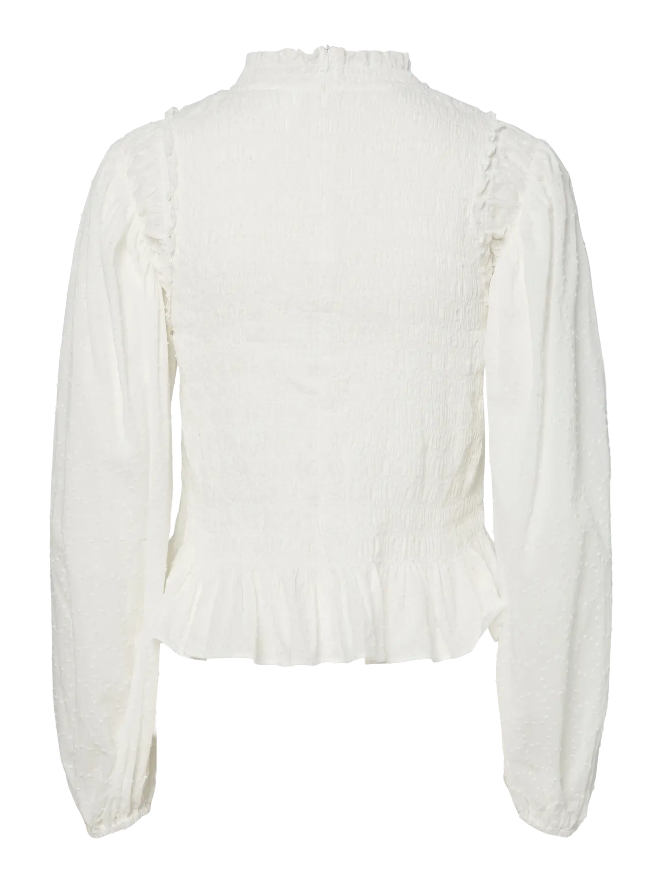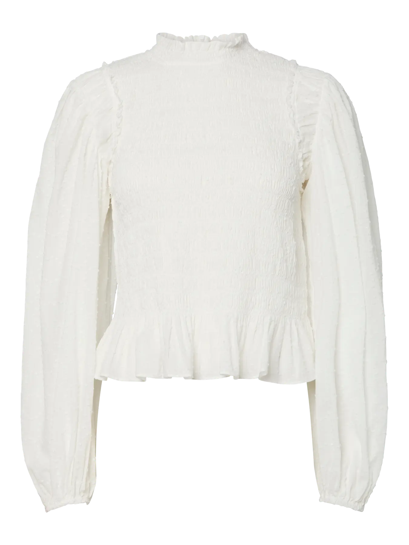 Dit witte topje is perfect voor een romantische en chique look. Het heeft een opvallende smocked detail aan de bovenkant en op de mouwen, wat zorgt voor een flatterende pasvorm. De lange pofmouwen en de peplum aan de onderkant geven het een speelse en vrouwelijke uitstraling. Gemaakt van 100% katoen, het voelt licht en comfortabel aan op de huid.