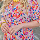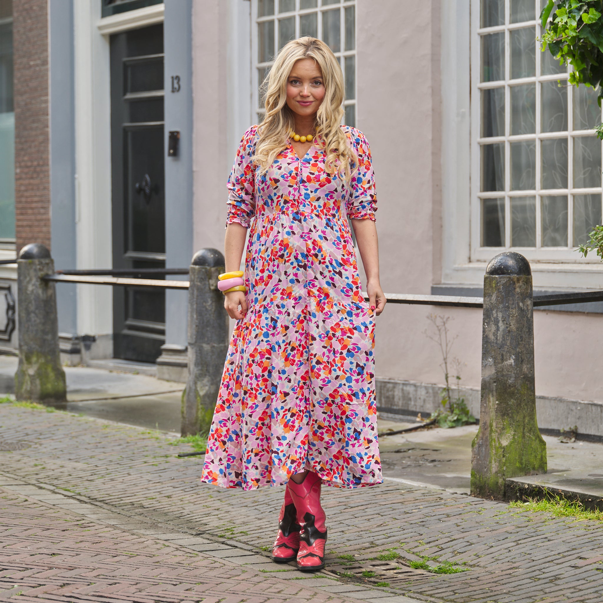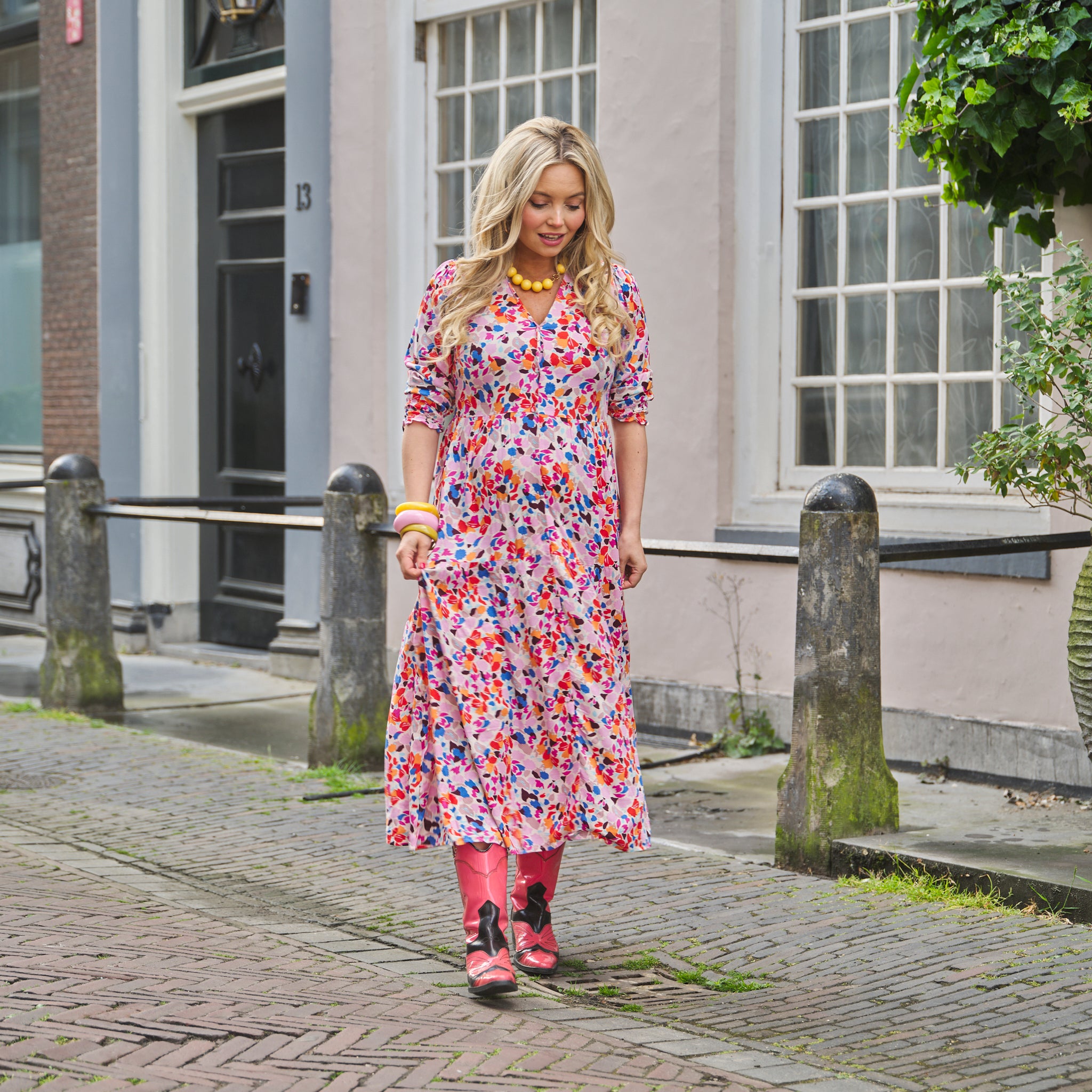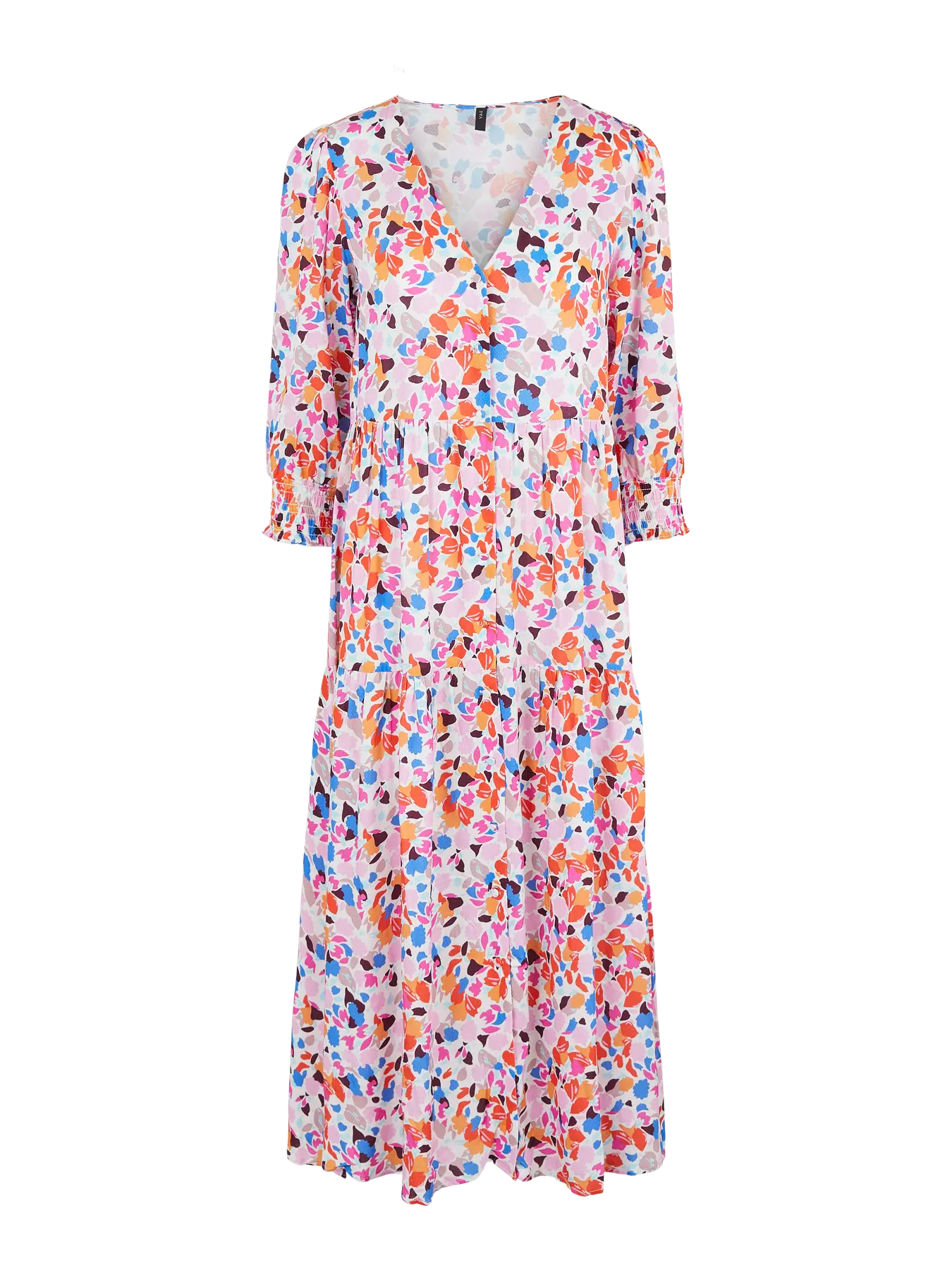 Dompel jezelf onder in de vrolijke kleuren van de YAS Alira 3/4 Long Dress! Deze jurk is een ware blikvanger met haar levendige all-over print in roze-, blauw-, oranje- en roodtinten. De flatterende V-hals en elegante 3/4 mouwen maken deze jurk perfect voor elke gelegenheid.