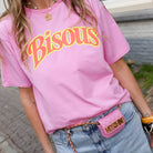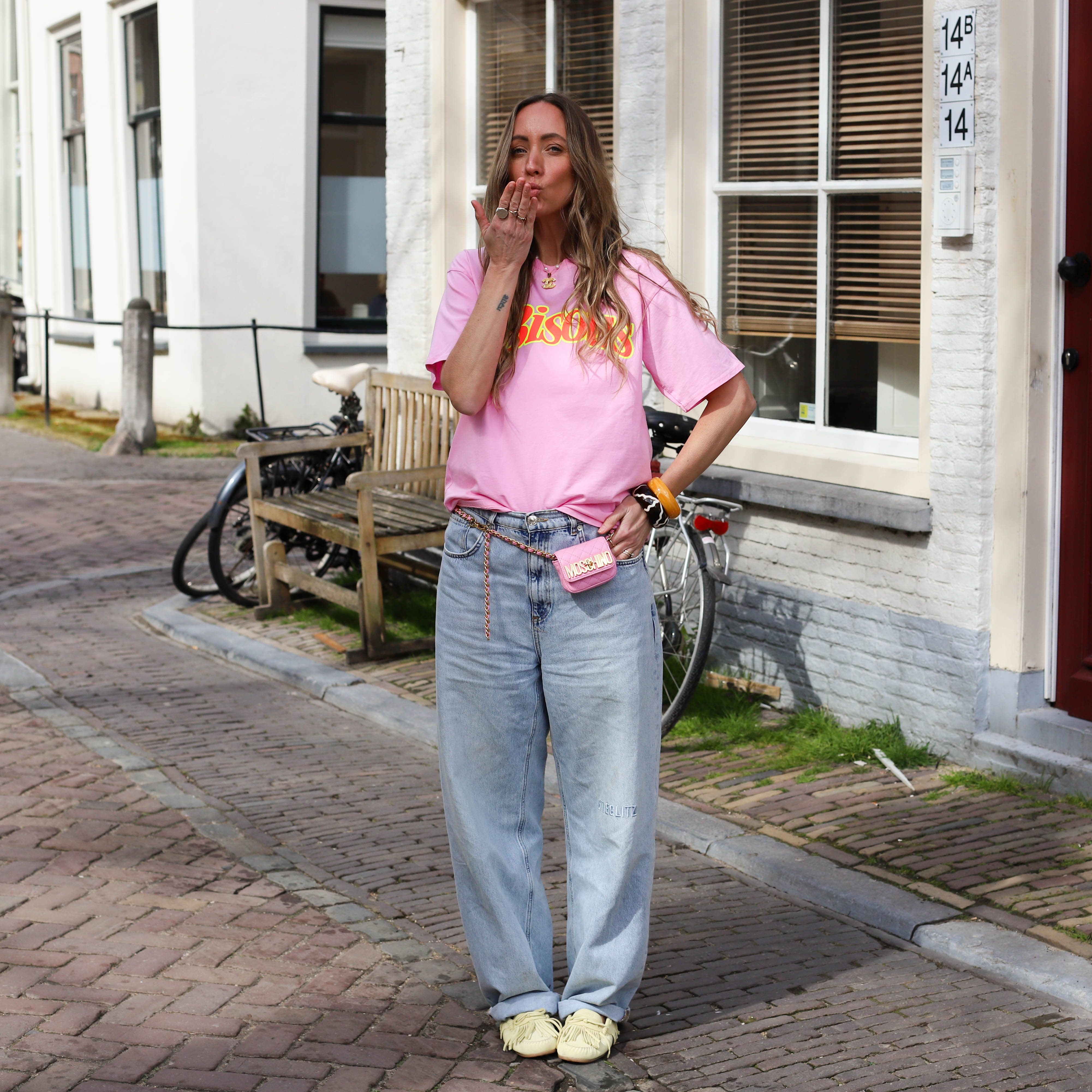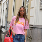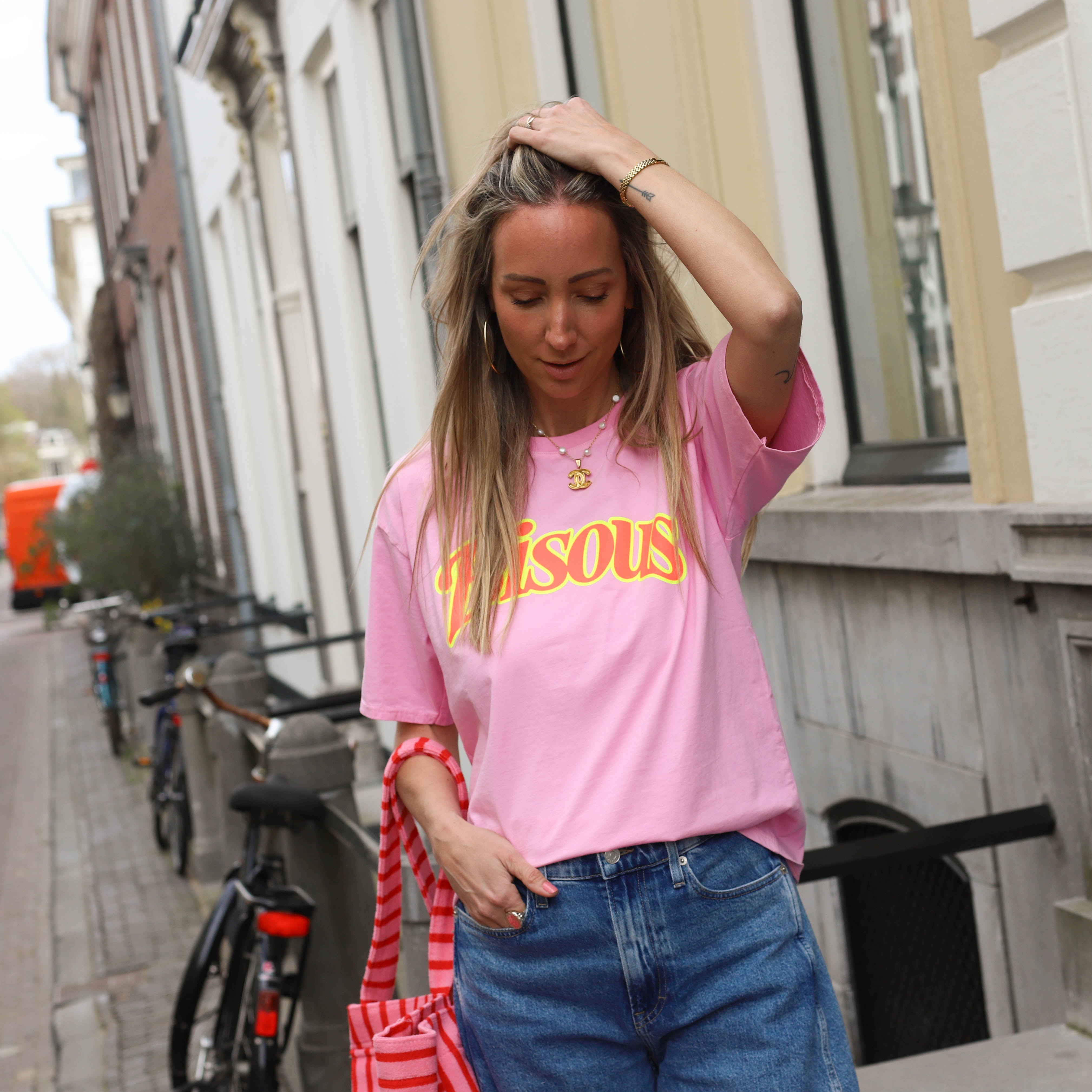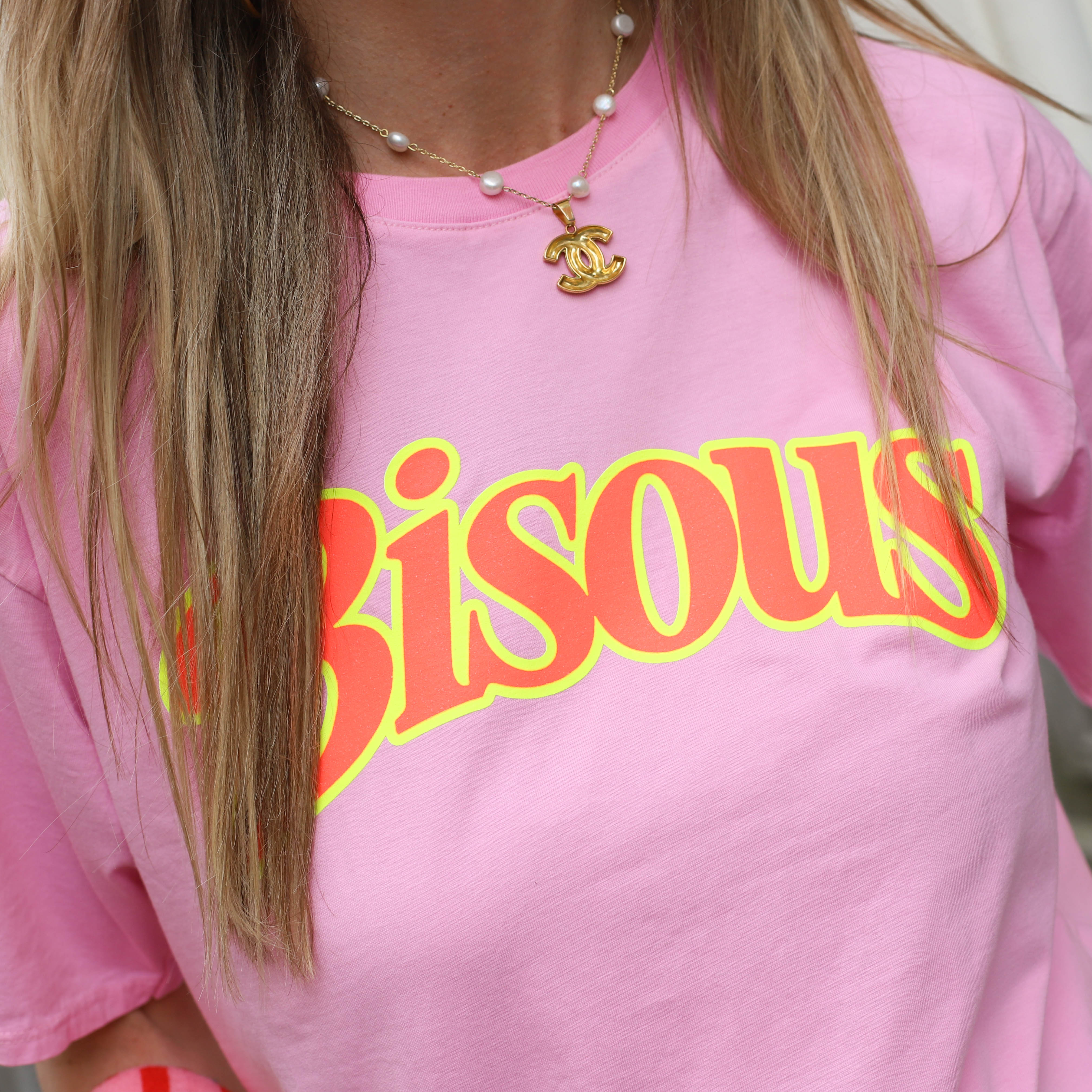 Dit leuke roze T-shirt heeft een nonchalante, oversized pasvorm en is voorzien van een klassieke ronde hals. Op de borst staat de gele oranje tekst "Bisous" in een speels lettertype, uitgevoerd in een opvallende kleurencombinatie die het shirt een trendy uitstraling geeft. Combineer met een leuke jeans.