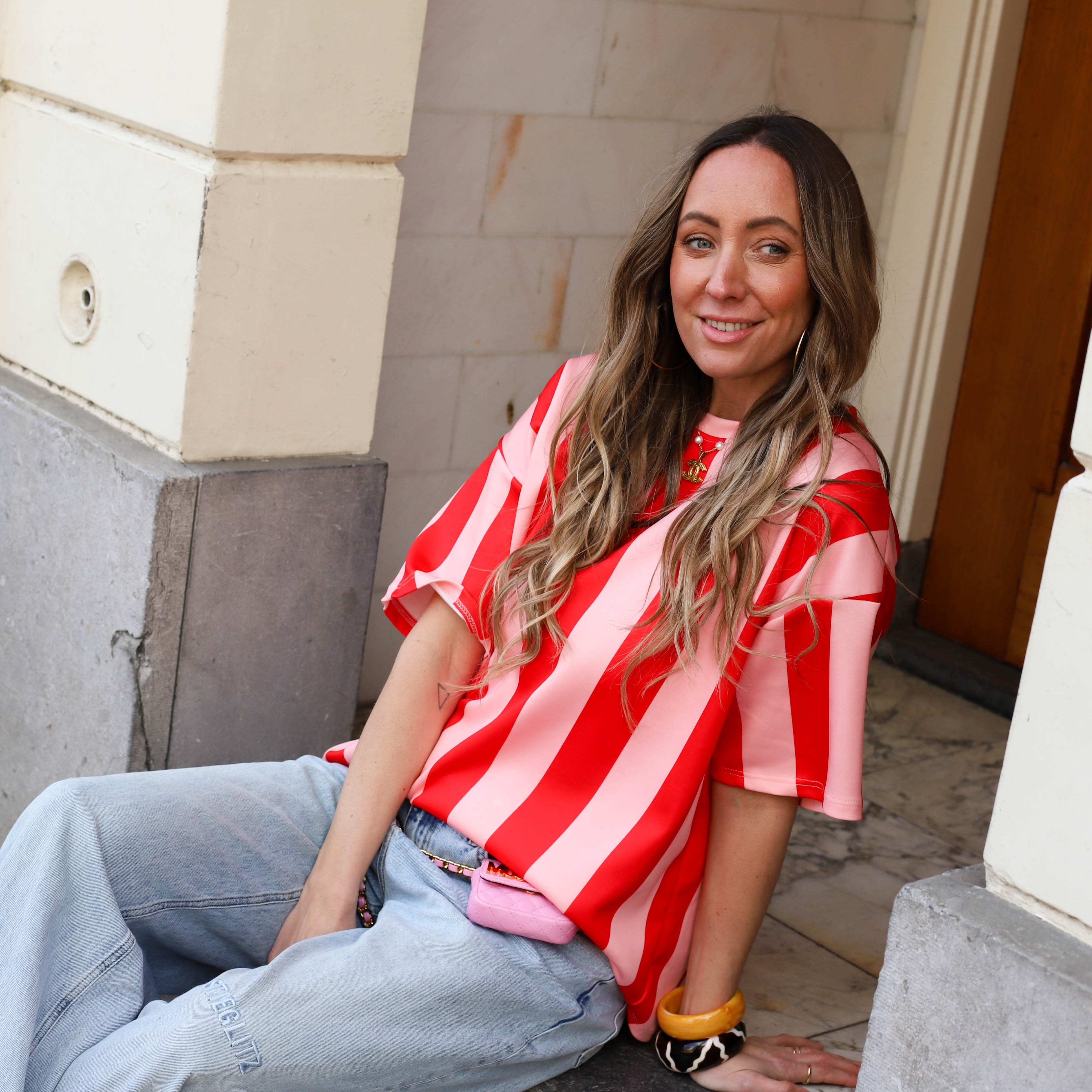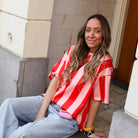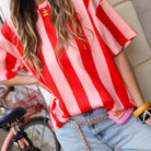 Maak een statement met dit T-shirt voorzien van een opvallend verticaal streeppatroon in het roze en rood. Het shirt heeft een moderne, oversized pasvorm met verlaagde schoudernaden en een klassieke ronde hals. Combineer met een leuke jeans.