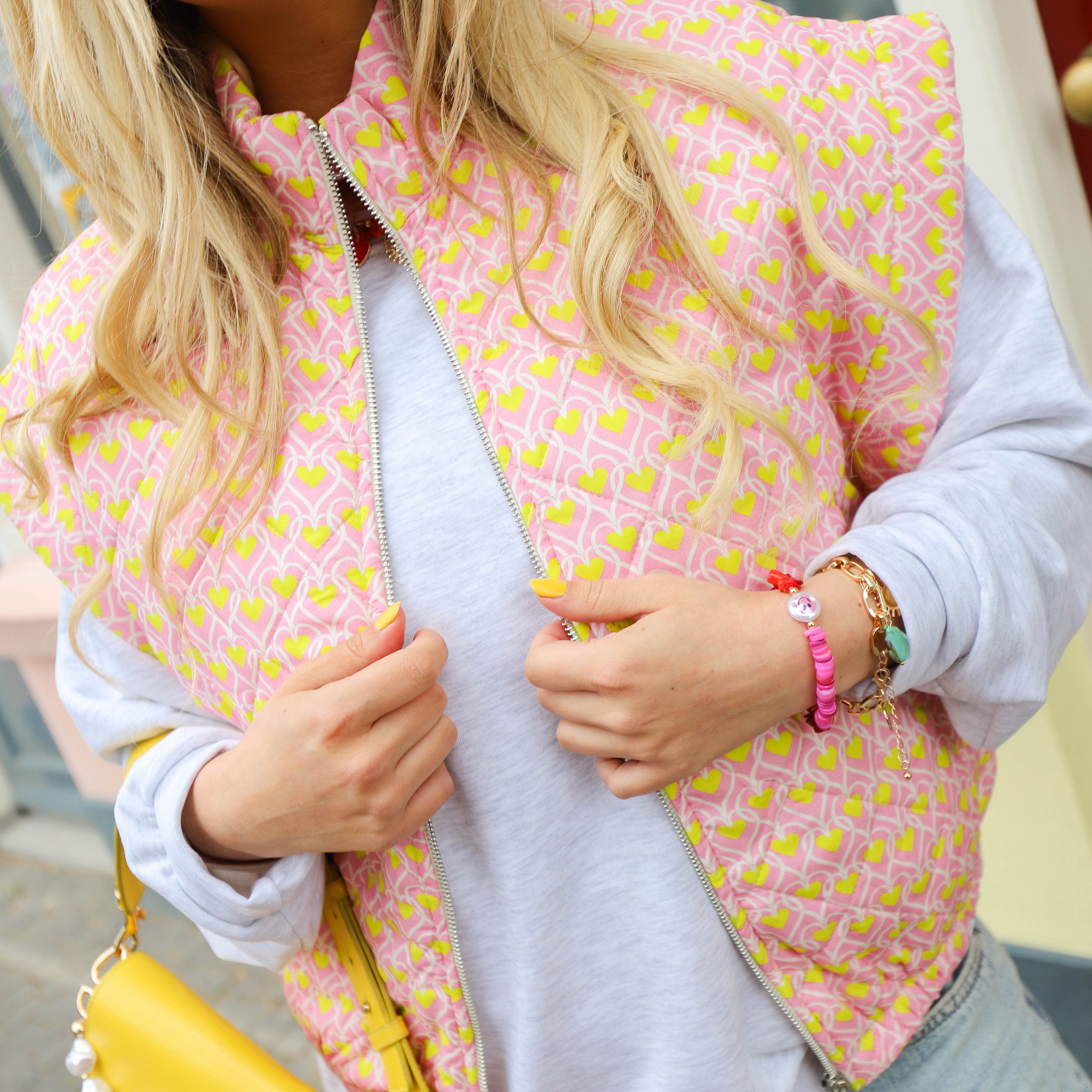 Dit trendy gilet met een opvallende print in roze en geel is een echte blikvanger. Het gilet heeft een comfortabele pasvorm en is perfect om over een shirt, blouse of jurk te dragen voor een extra warme en stijlvolle laag. Een uniek item om je outfit mee op te fleuren!