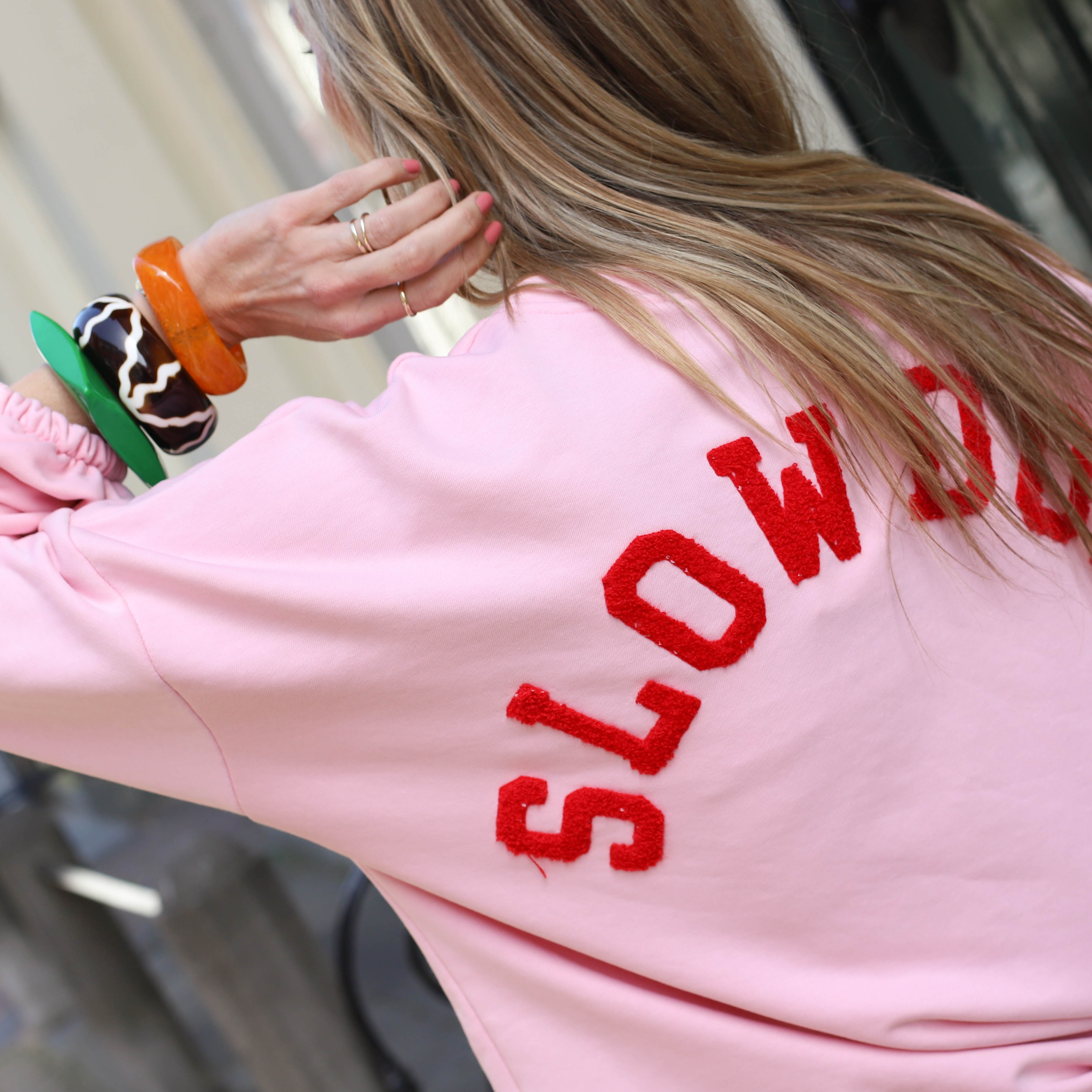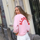 Deze té gekke lichtroze sweater is dé perfecte combinatie van comfort en een krachtige boodschap. Met zijn opvallende, rood getufte 'SLOW DOWN' tekst op de rug geef je niet alleen een mode-statement af, maar ook een herinnering om af en toe eens pas op de plaats te maken. Dankzij de zachte fleecevoering en de comfortabele oversized fit is hij bovendien heerlijk om te dragen. De geribde boorden en de klassieke ronde hals maken deze sweater helemaal af.