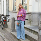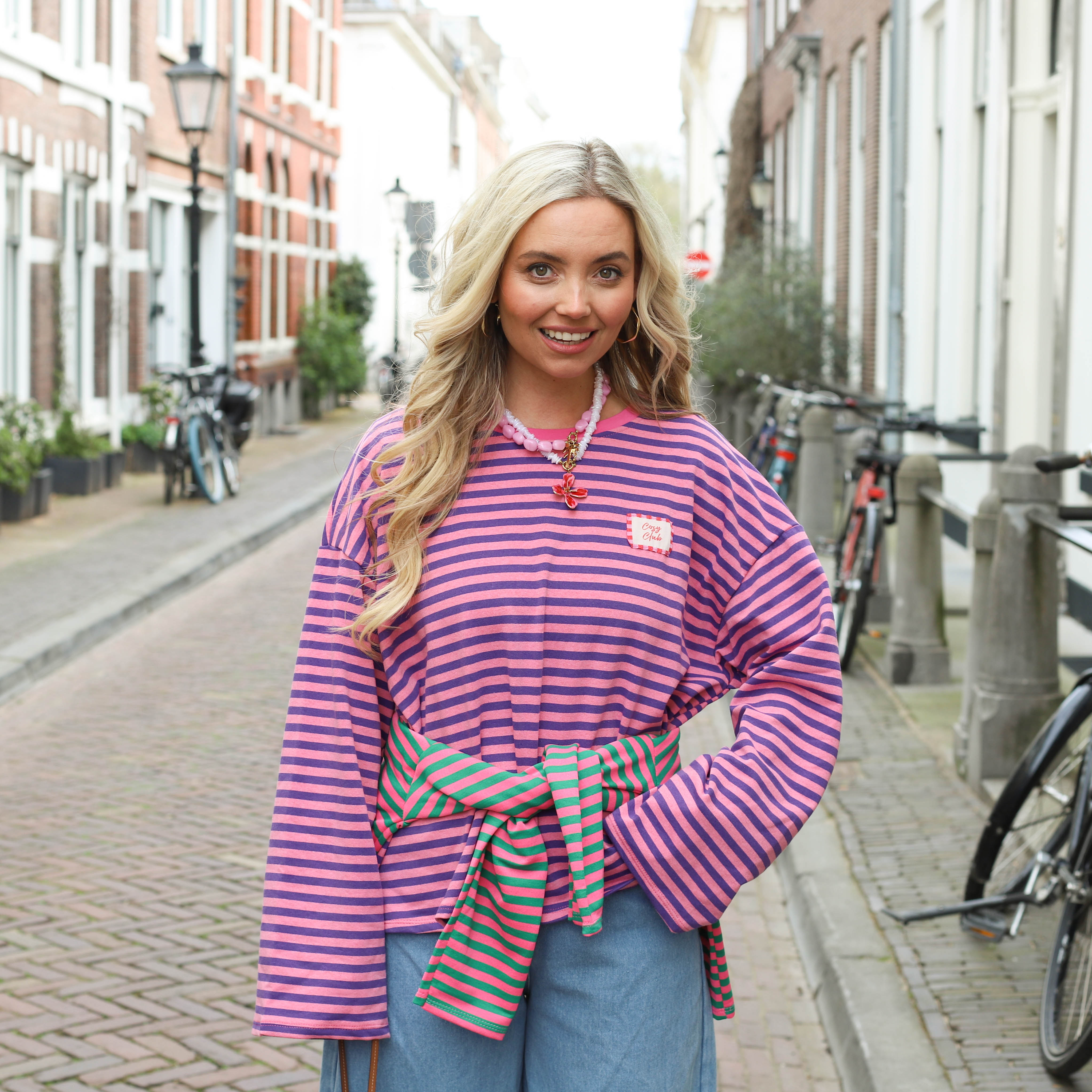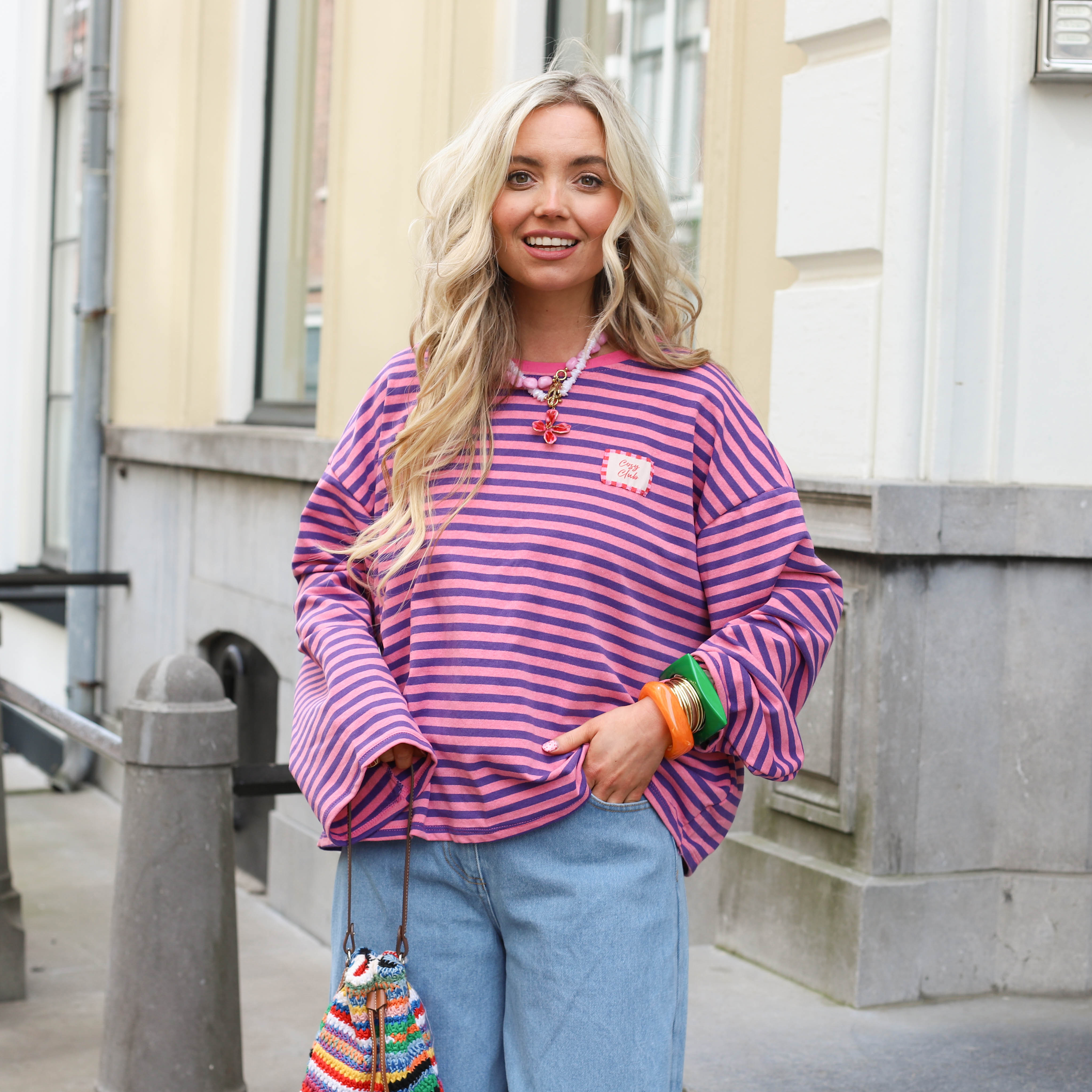 Trendy sweater met een speels streeppatroon in roze en paars. De combinatie van kleuren geeft een frisse en opvallende look, terwijl de comfortabele pasvorm zorgt voor een relaxte uitstraling.