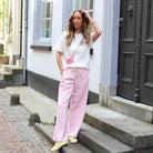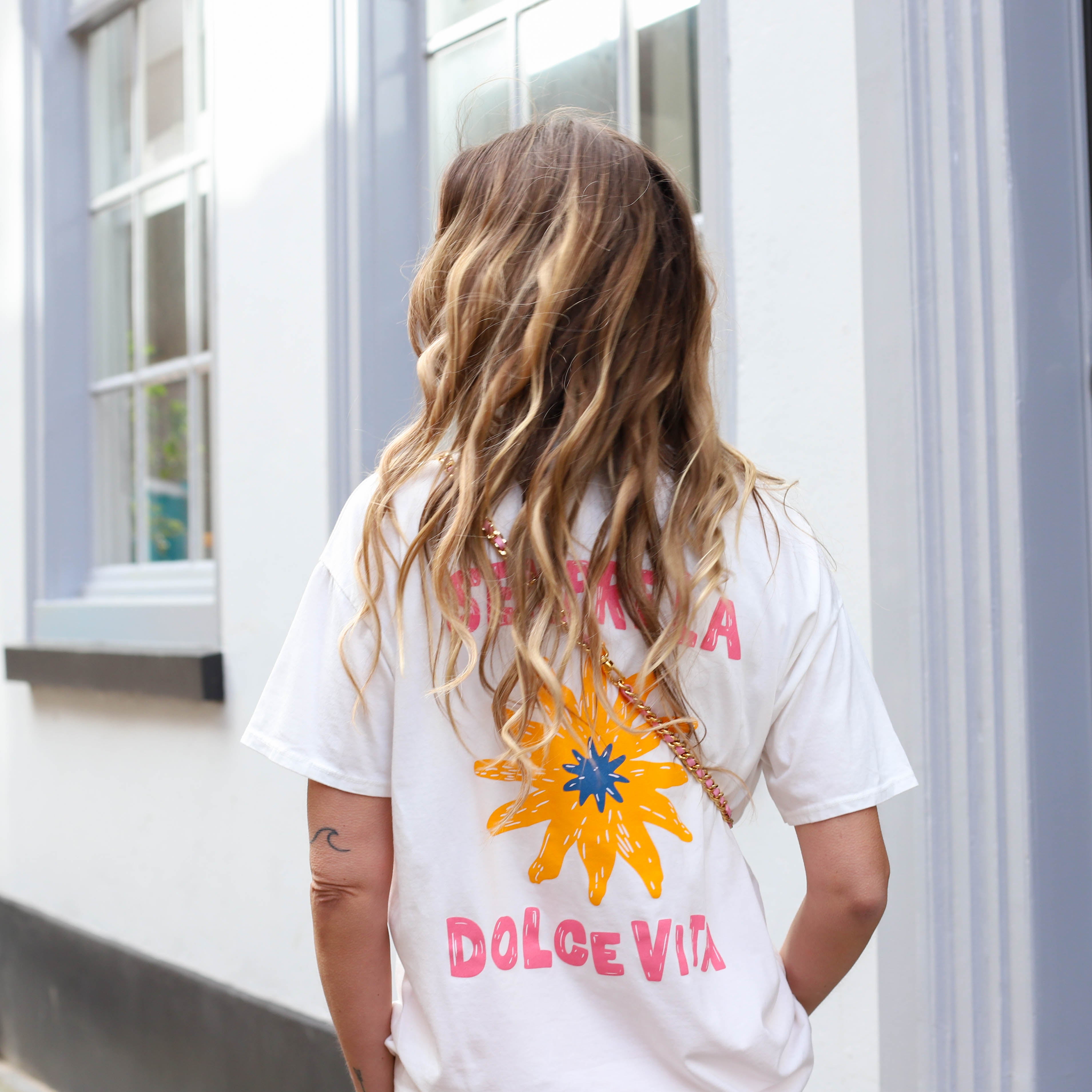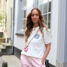 Dit witte t-shirt heeft een stoere, gewassen look en een comfortabele, oversized pasvorm. Op de borst is een opvallend roze kader geprint met de tekst "SUMMER LOVE CLUB". Combineer dit leuke shirtje met een jeans of rok.