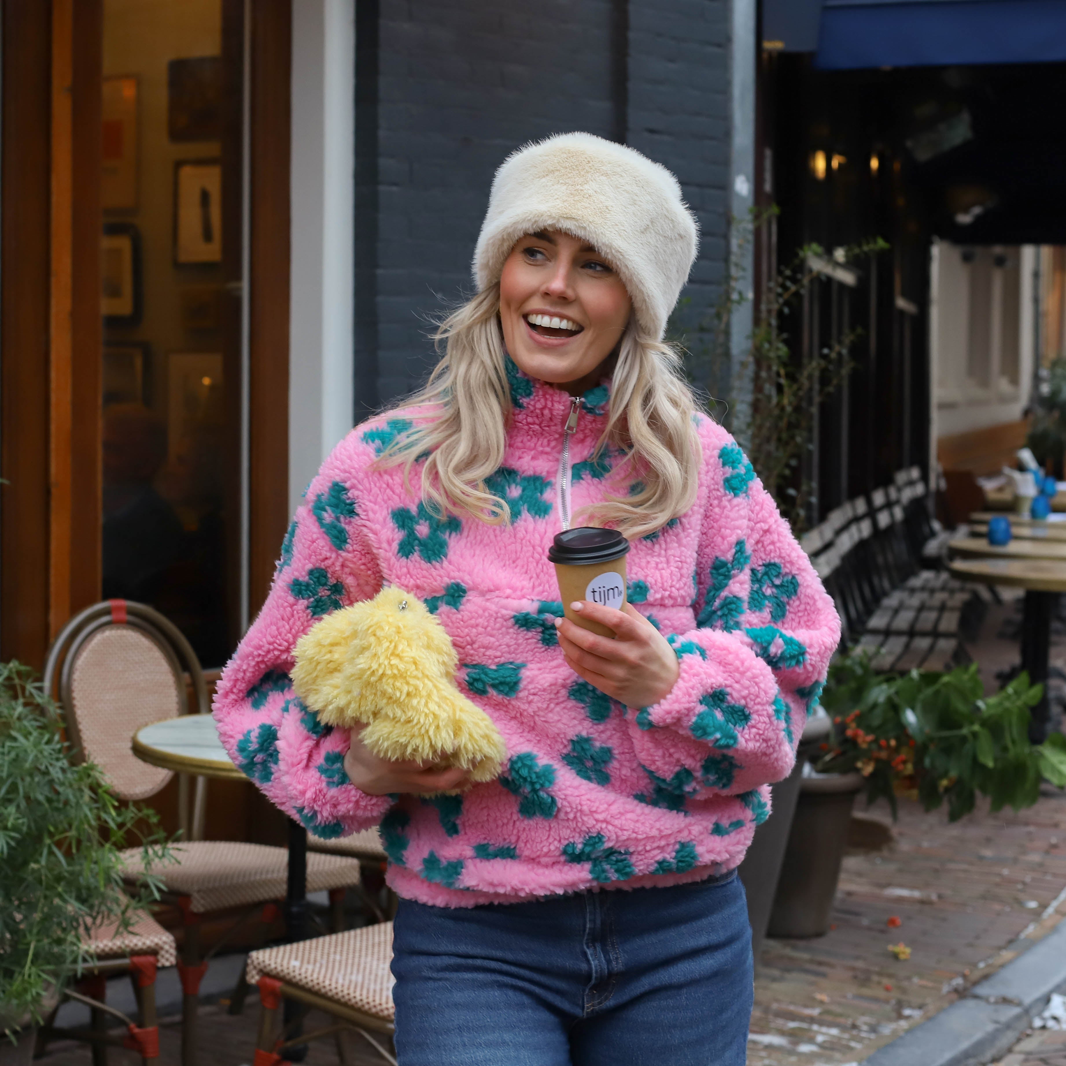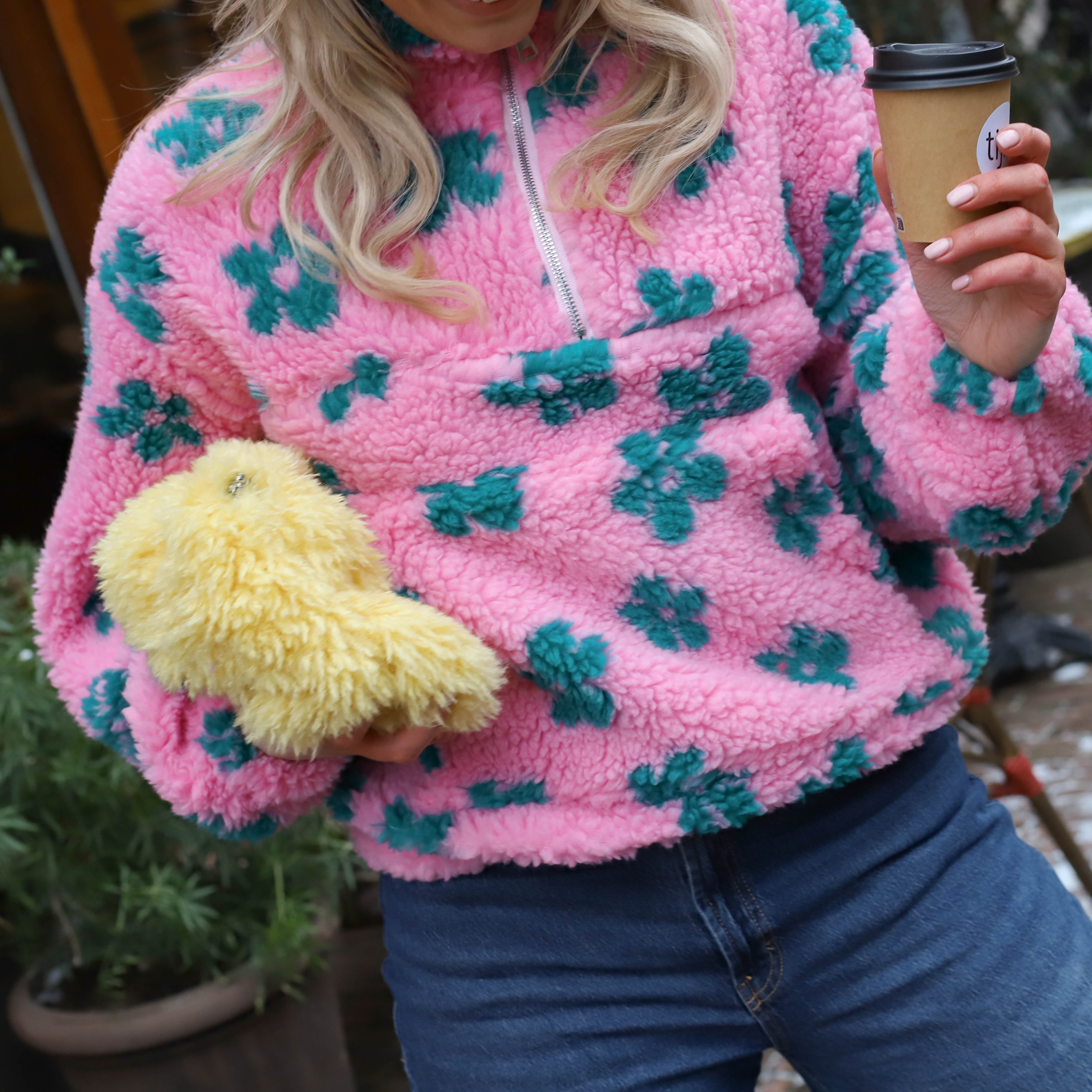 Deze Teddy Jas is een leuke jas, perfect om kleur toe te voegen aan je look. De jas is gemaakt van zachte teddy fleece en heeft een opvallende lichtroze met een all-over patroon van groene bloemen. De ritssluiting, de hoge opstaande kraag en de comfortabele pasvorm maken dit een ideale cropped tussenjas.
