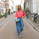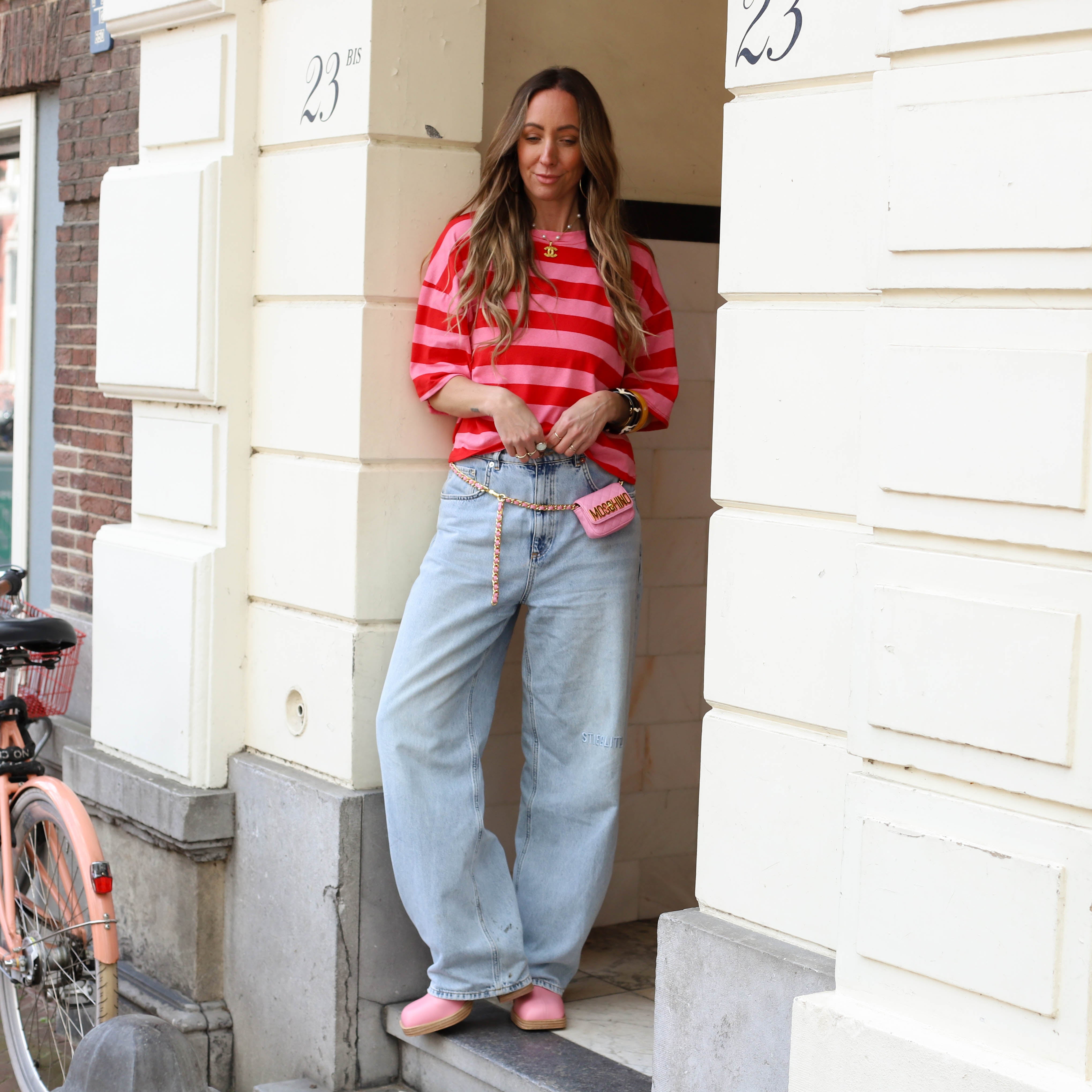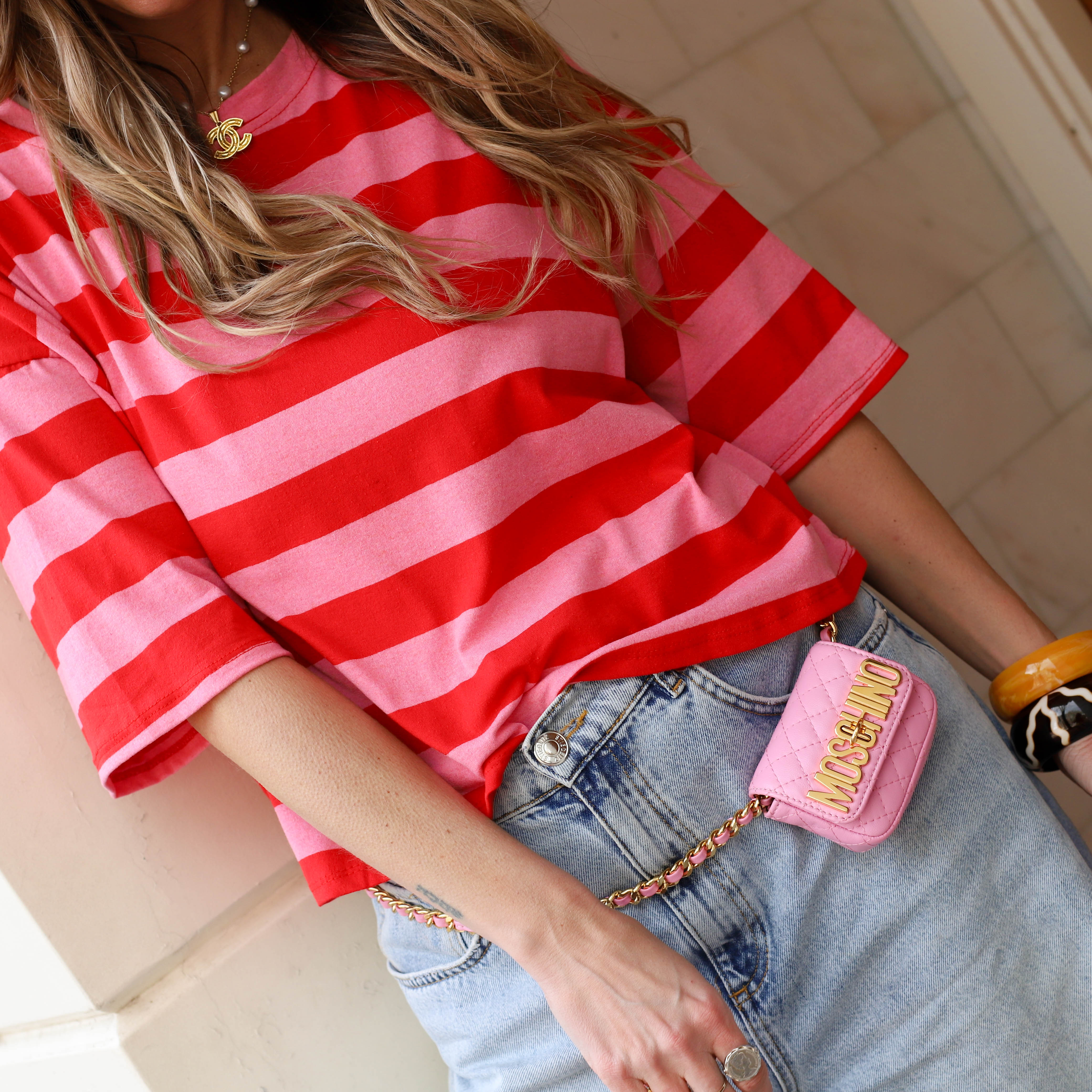 7Deze gestreepte top in roze en rood is een vrolijke toevoeging aan je dagelijkse rotatie. Het shirt heeft brede banen en een relaxte pasvorm met verlaagde schoudernaden, wat zorgt voor een nonchalante uitstraling. Gemaakt van een zachte katoenmix met stretch, is dit een ideale basistop voor een frisse lentedag. Makkelijk te combineren met een goede jeans of een casual rokje.